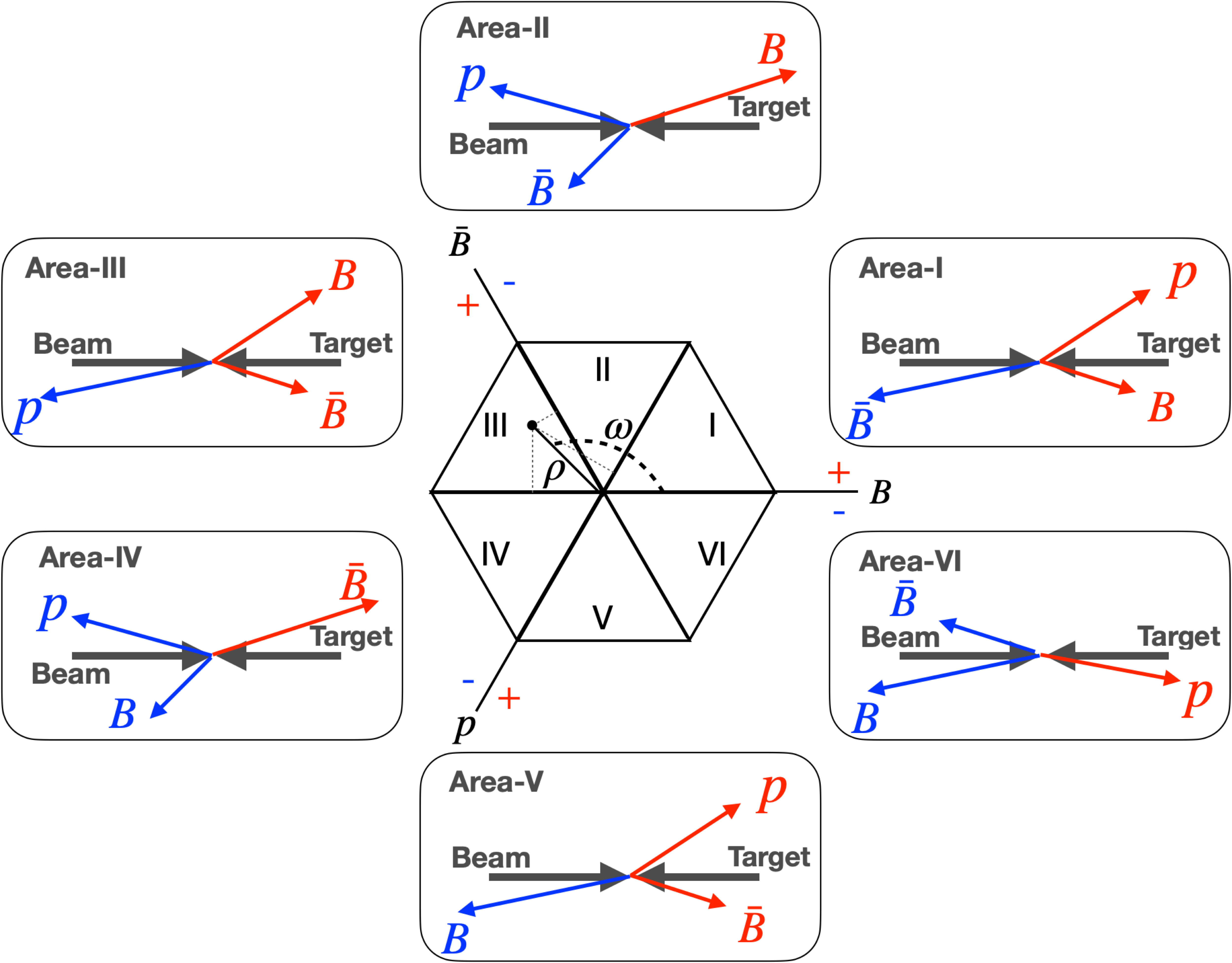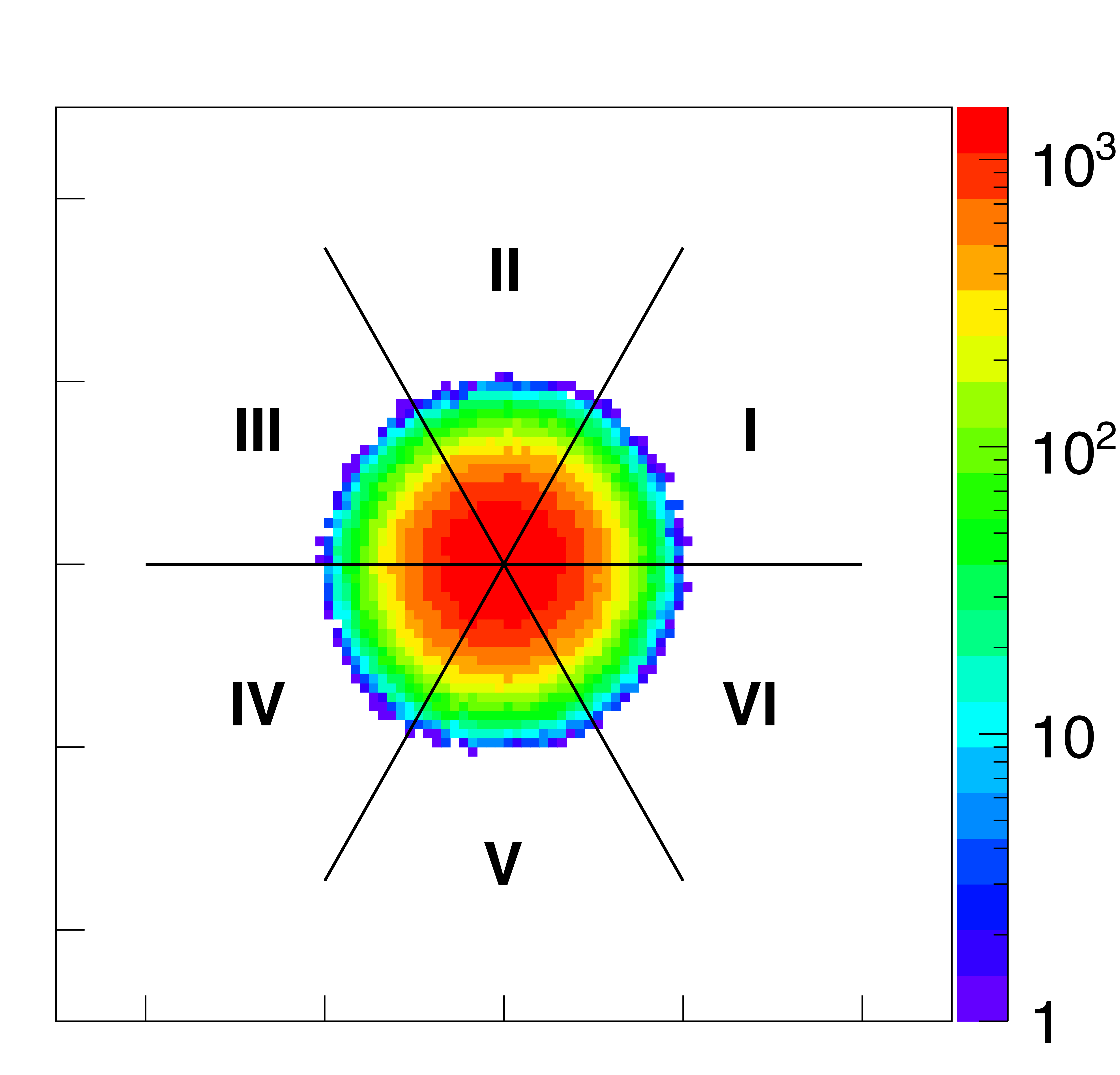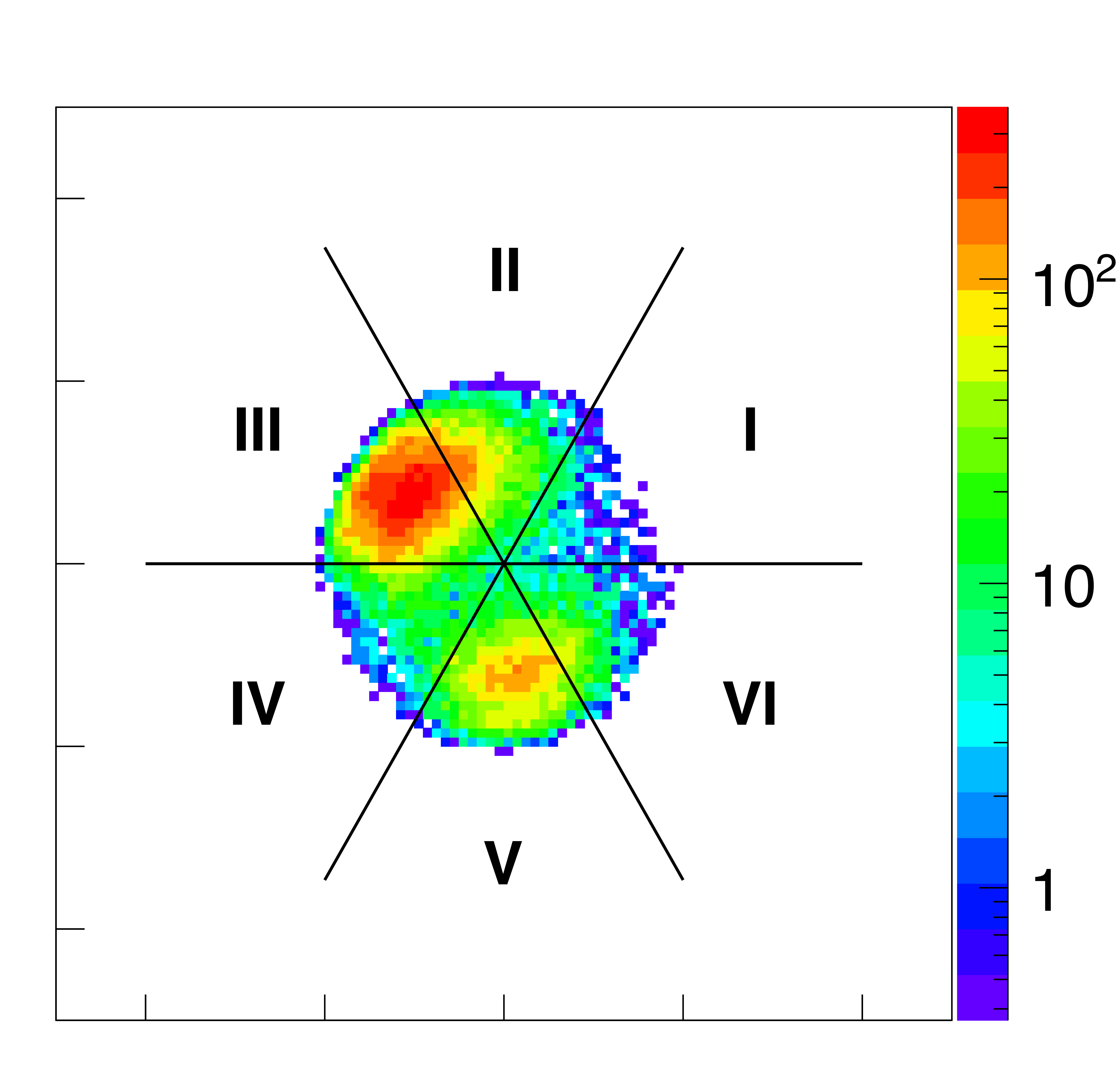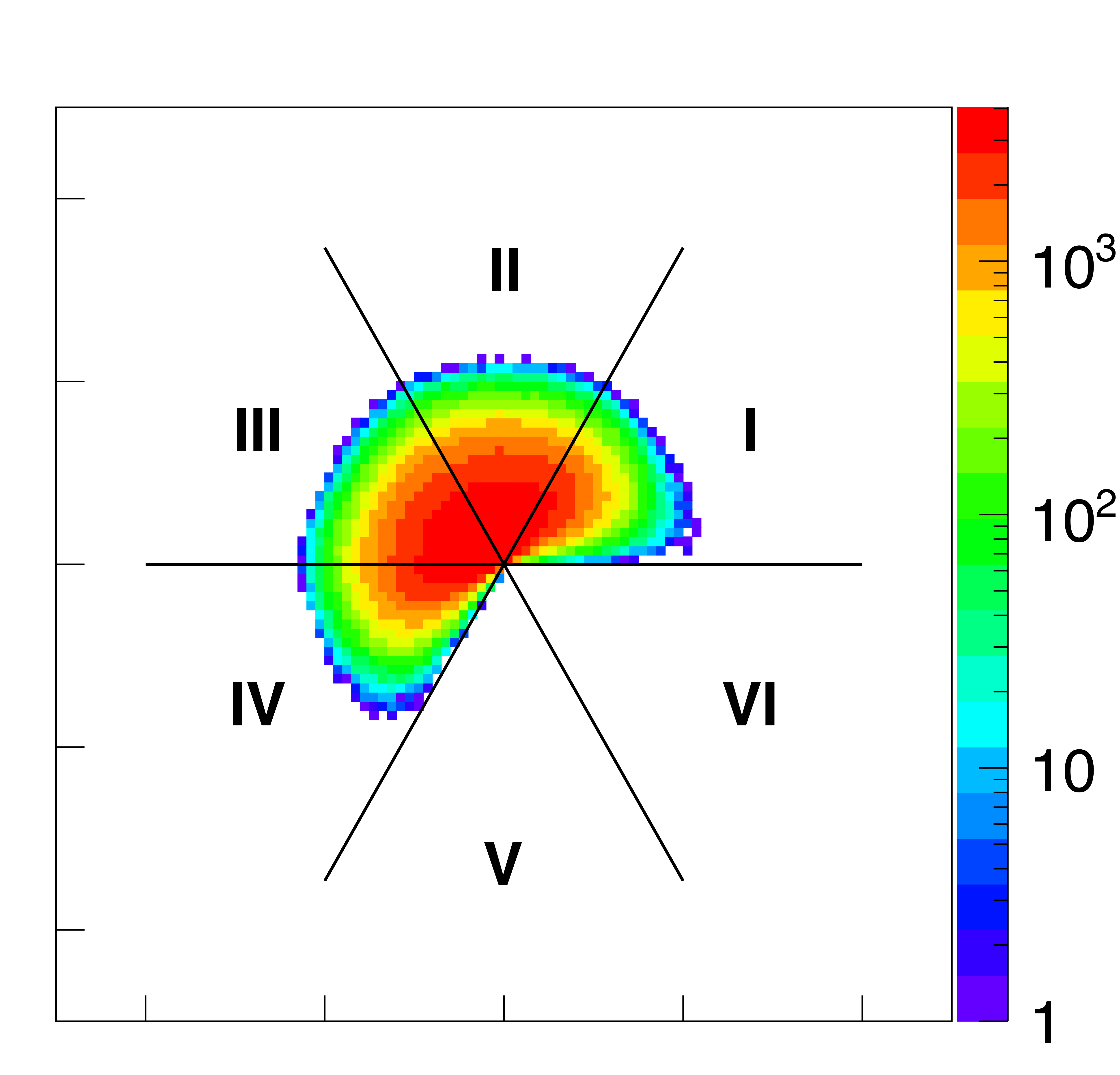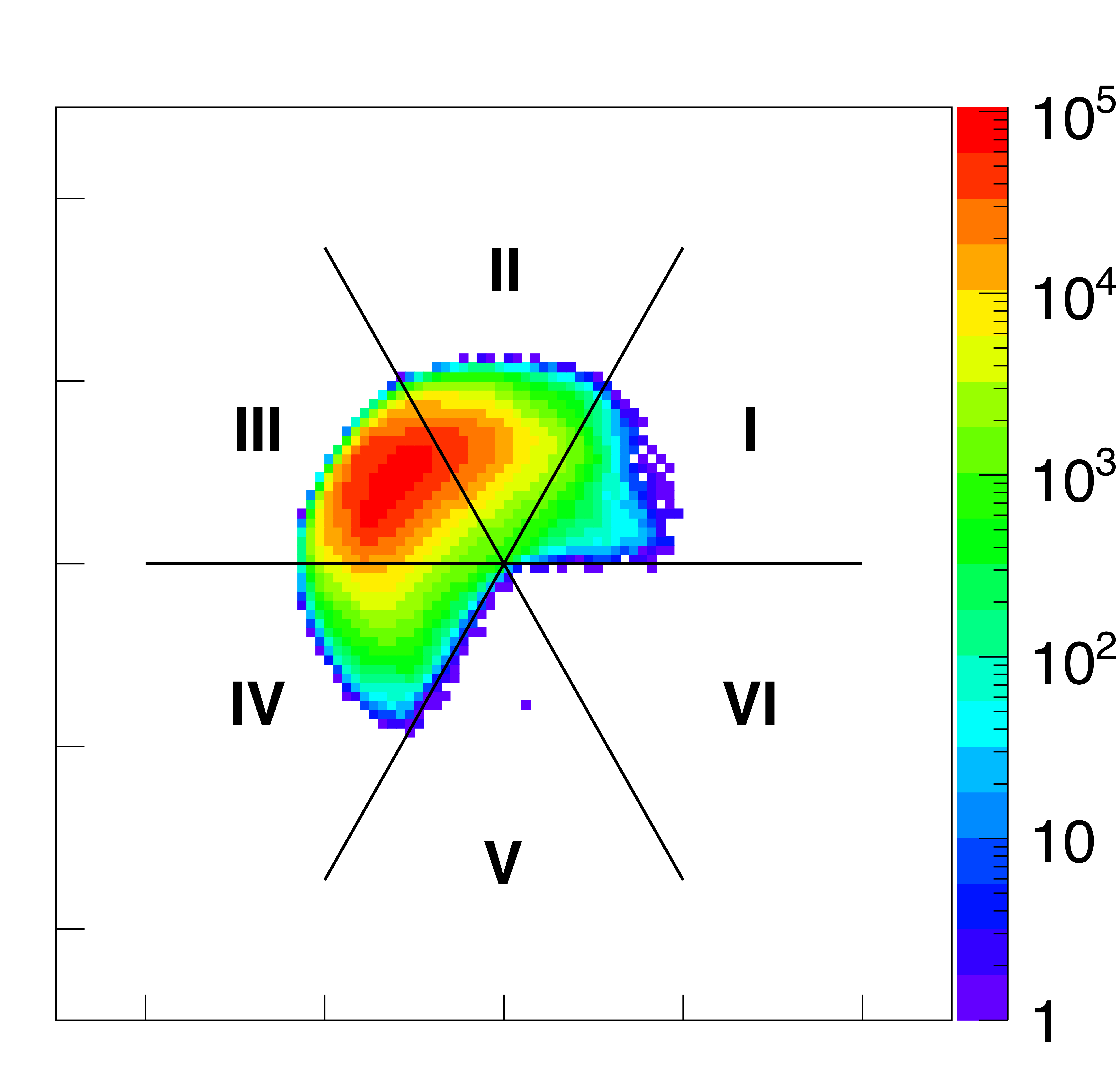 The six sectors on a Van Hove diagram that differentiate three-body angular correlations in six separate kinematic regions in the CM frame, as depicted in the pictures located around the center and marked by Roman numerals. See text for explanation. |