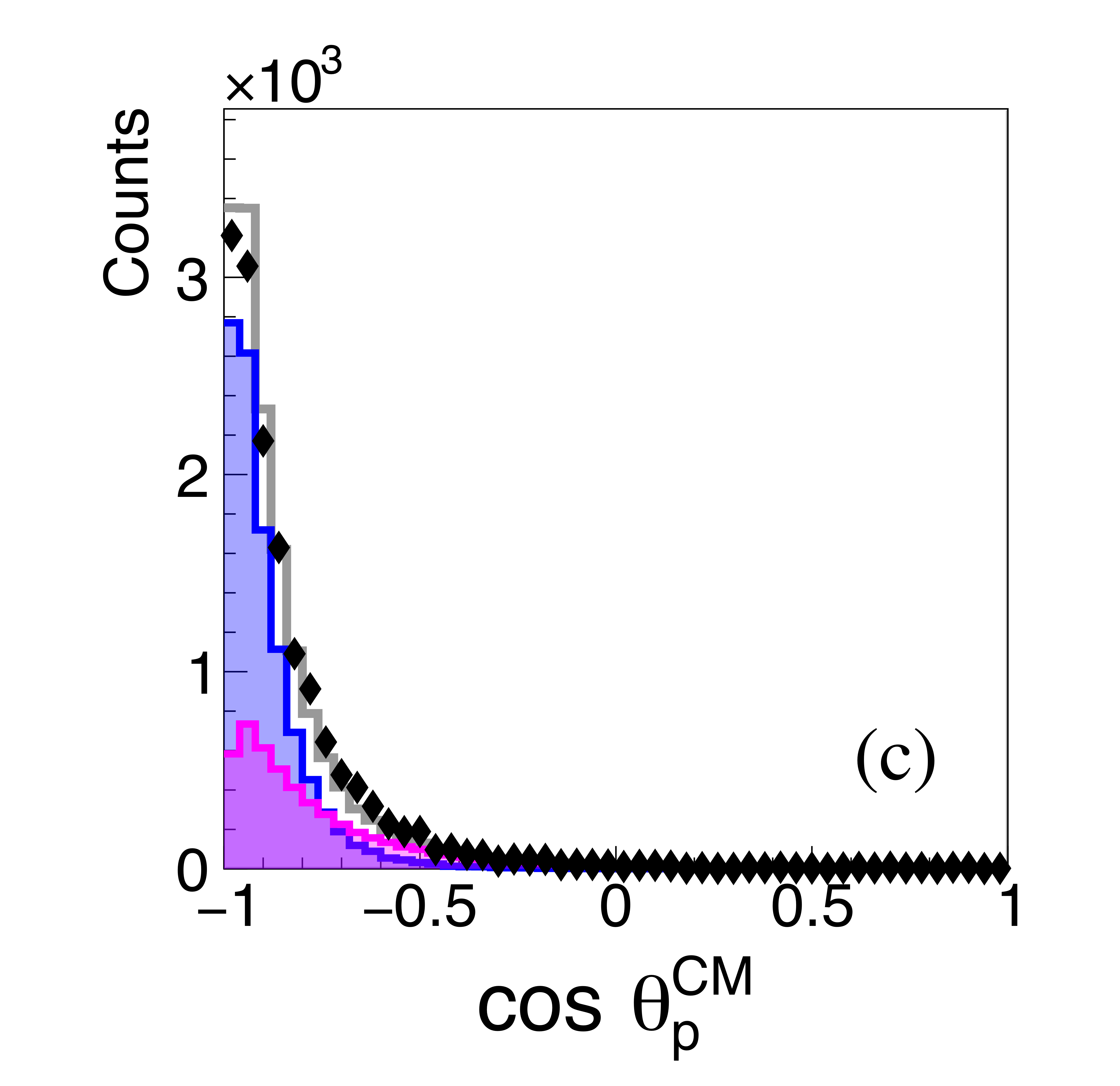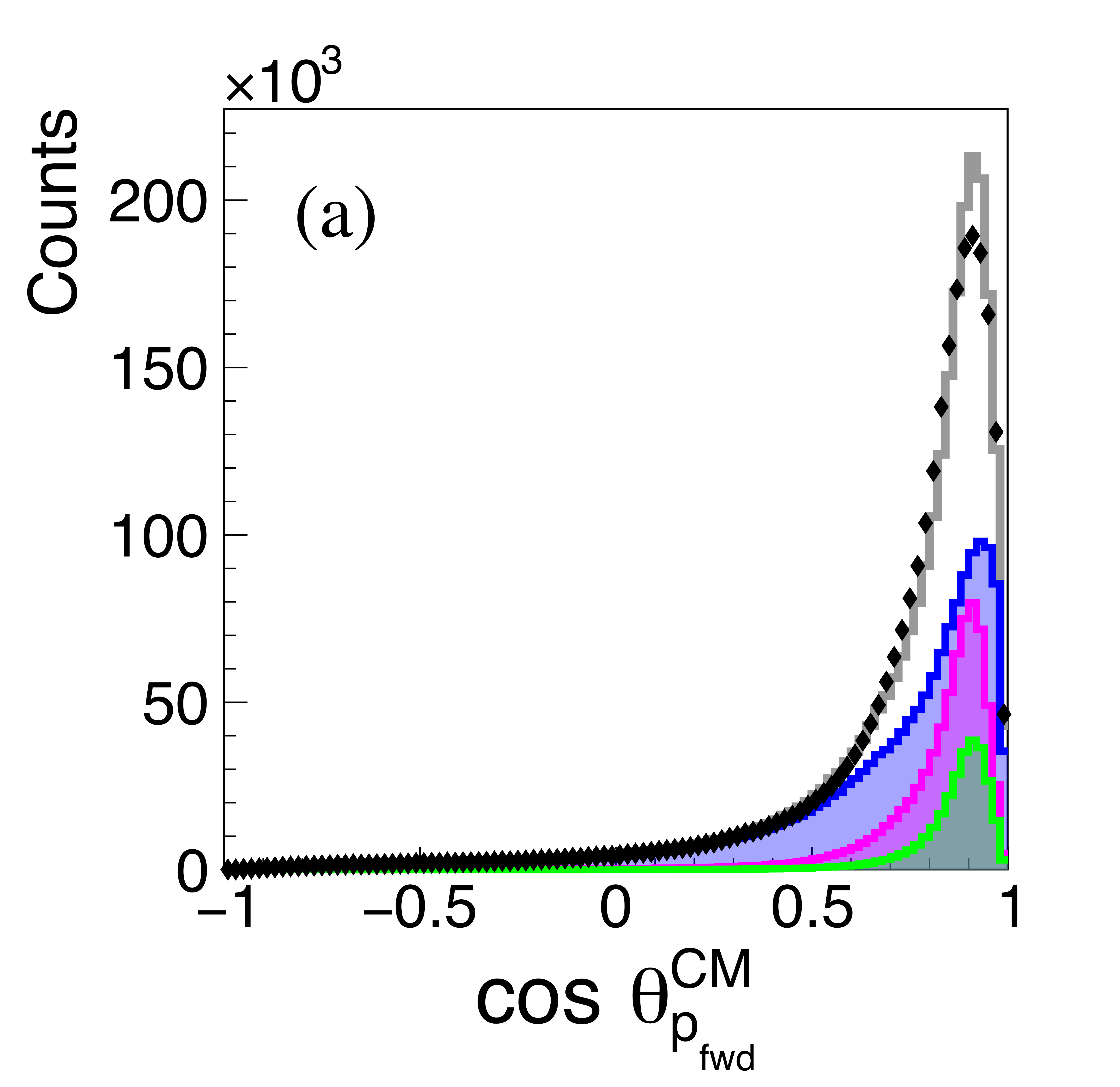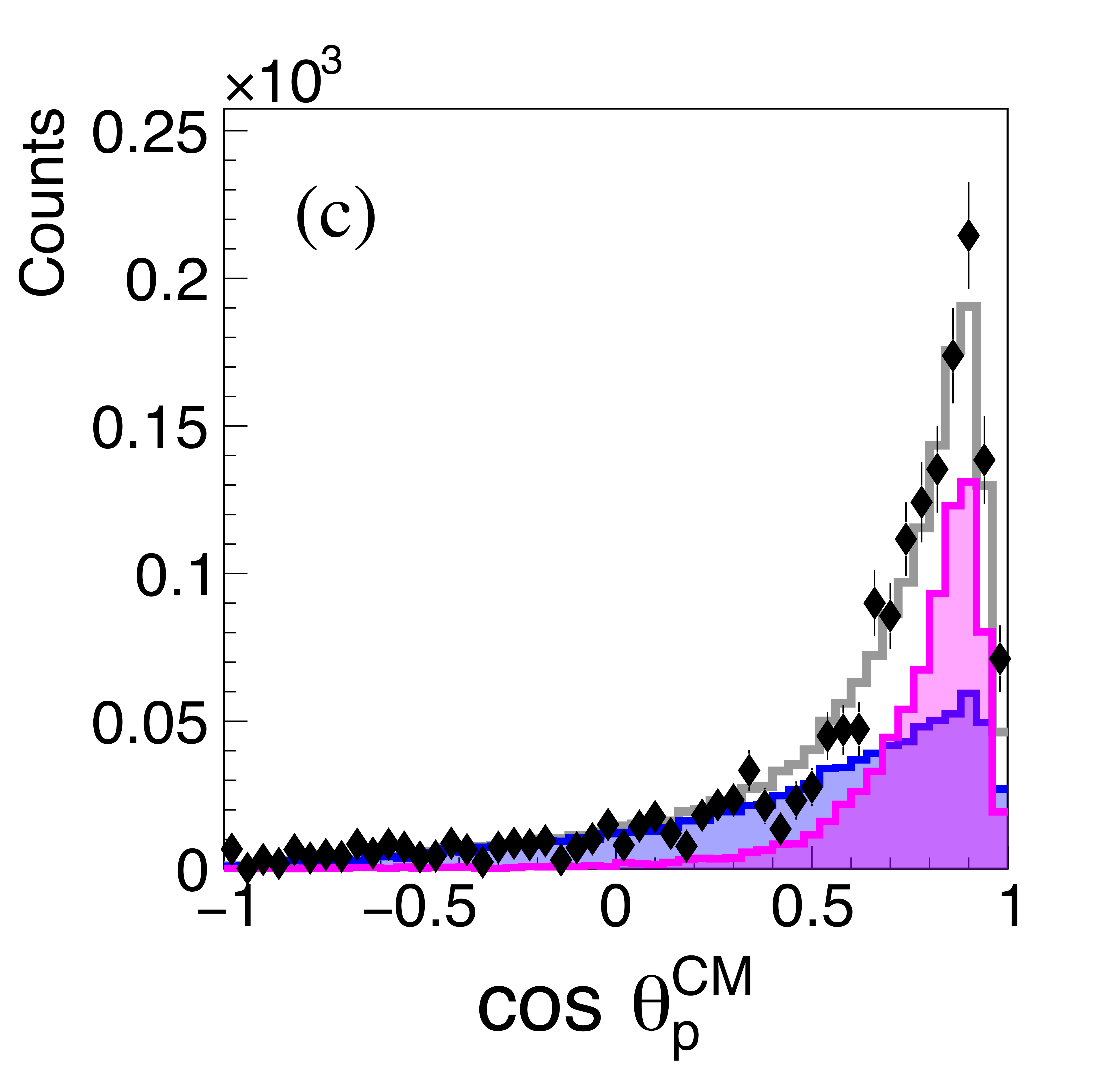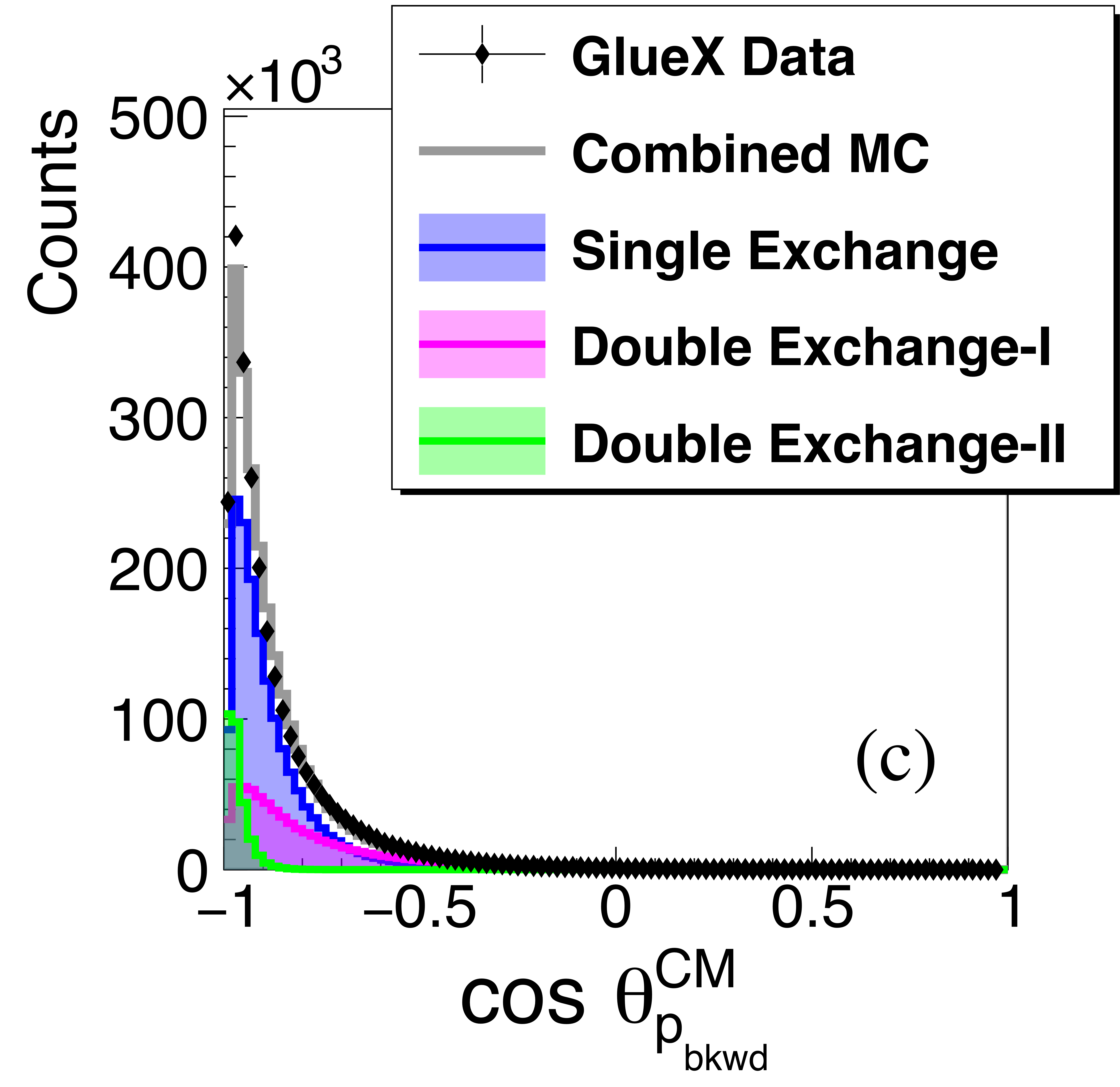 The angular distributions of the two protons (a), (c), and the anti-proton (b) in the $\gamma p \rightarrow p \bar{p} p $ reaction in the overall CM frame. Not acceptance corrected. The data are shown as black points and the summed simulation fit as a gray histogram. Components of the Monte Carlo simulations are shown as, Single Exchange (blue filled), Double Exchange-I (magenta filled), Double Exchange-II (green filled). |