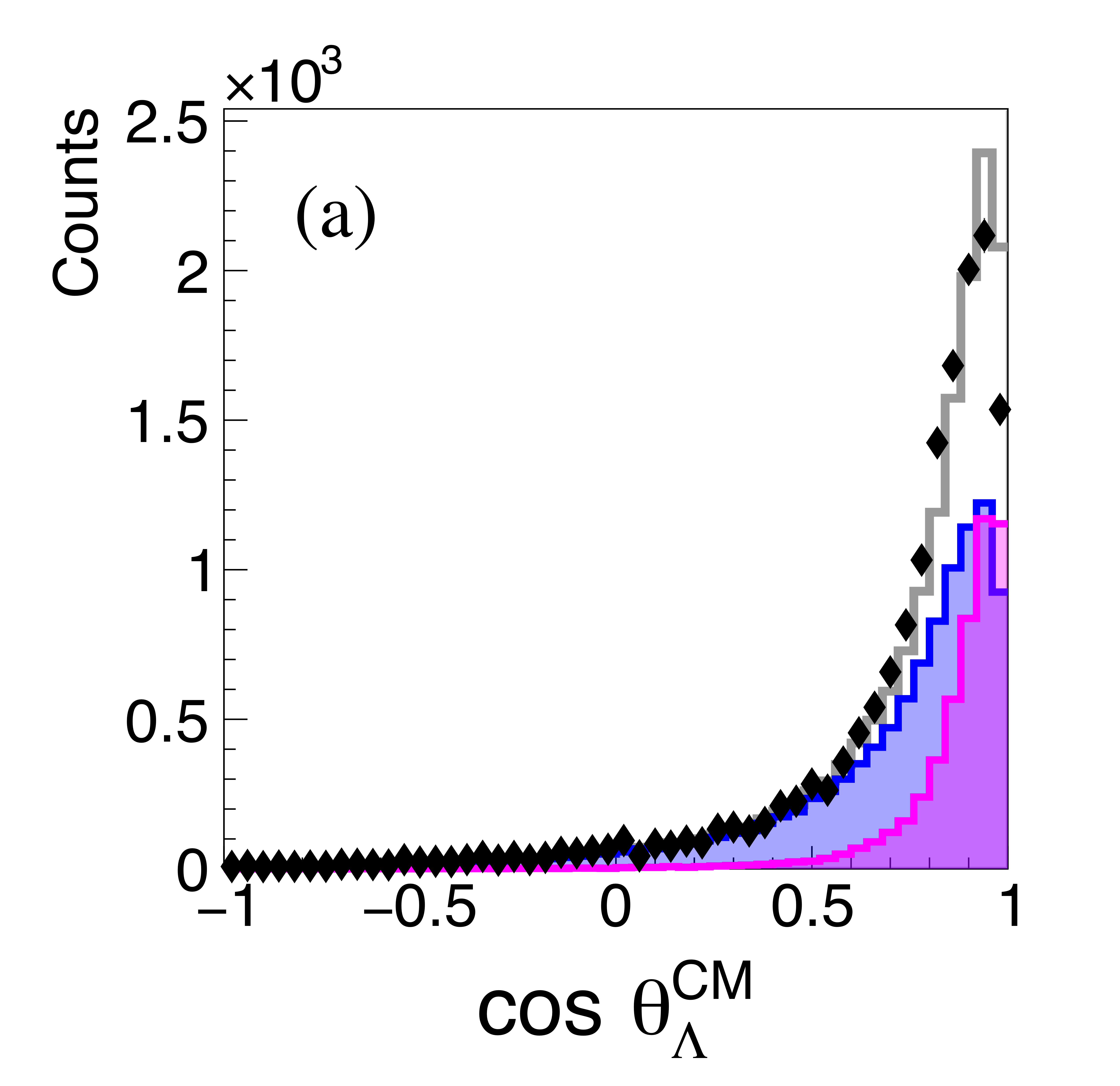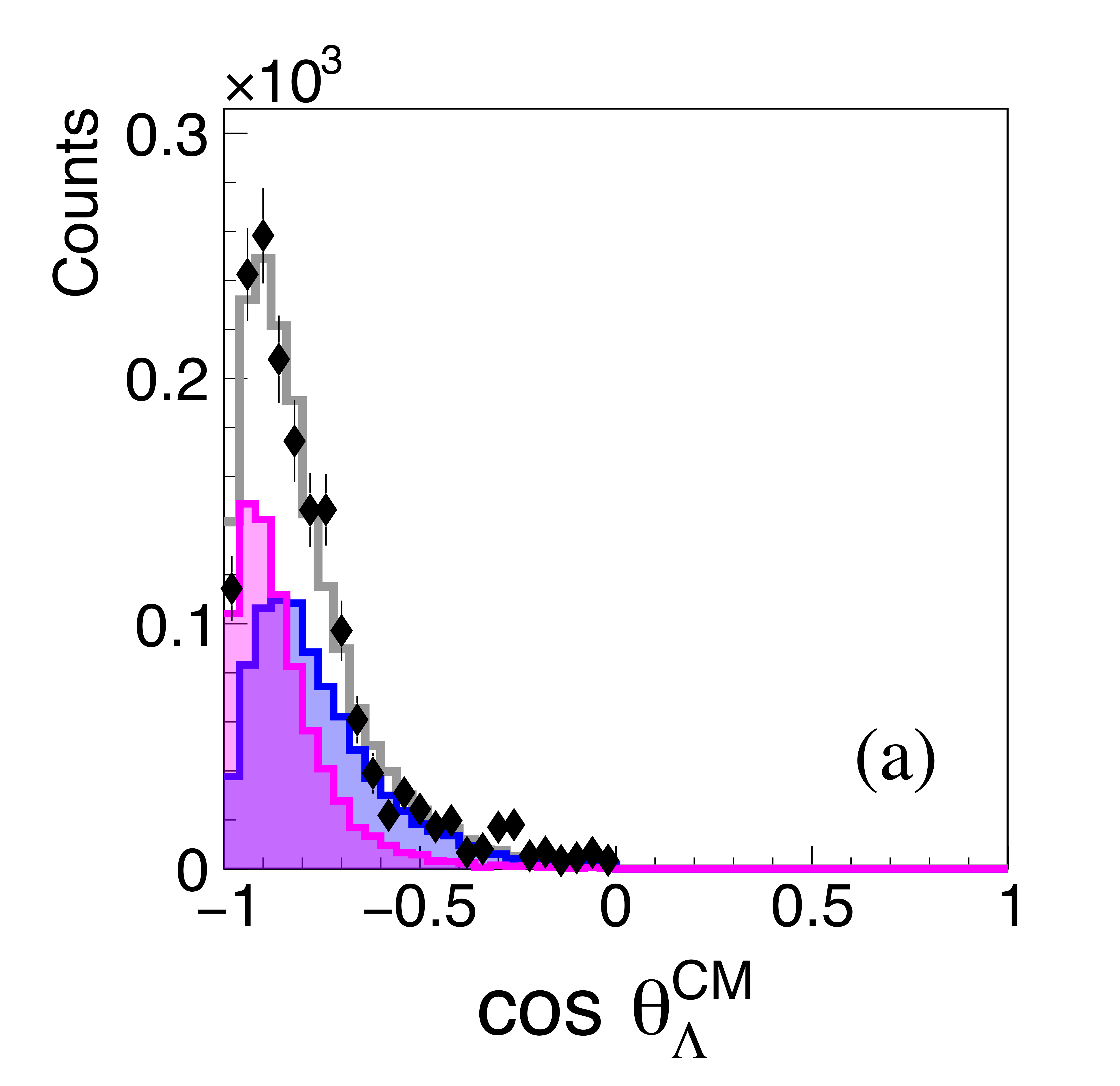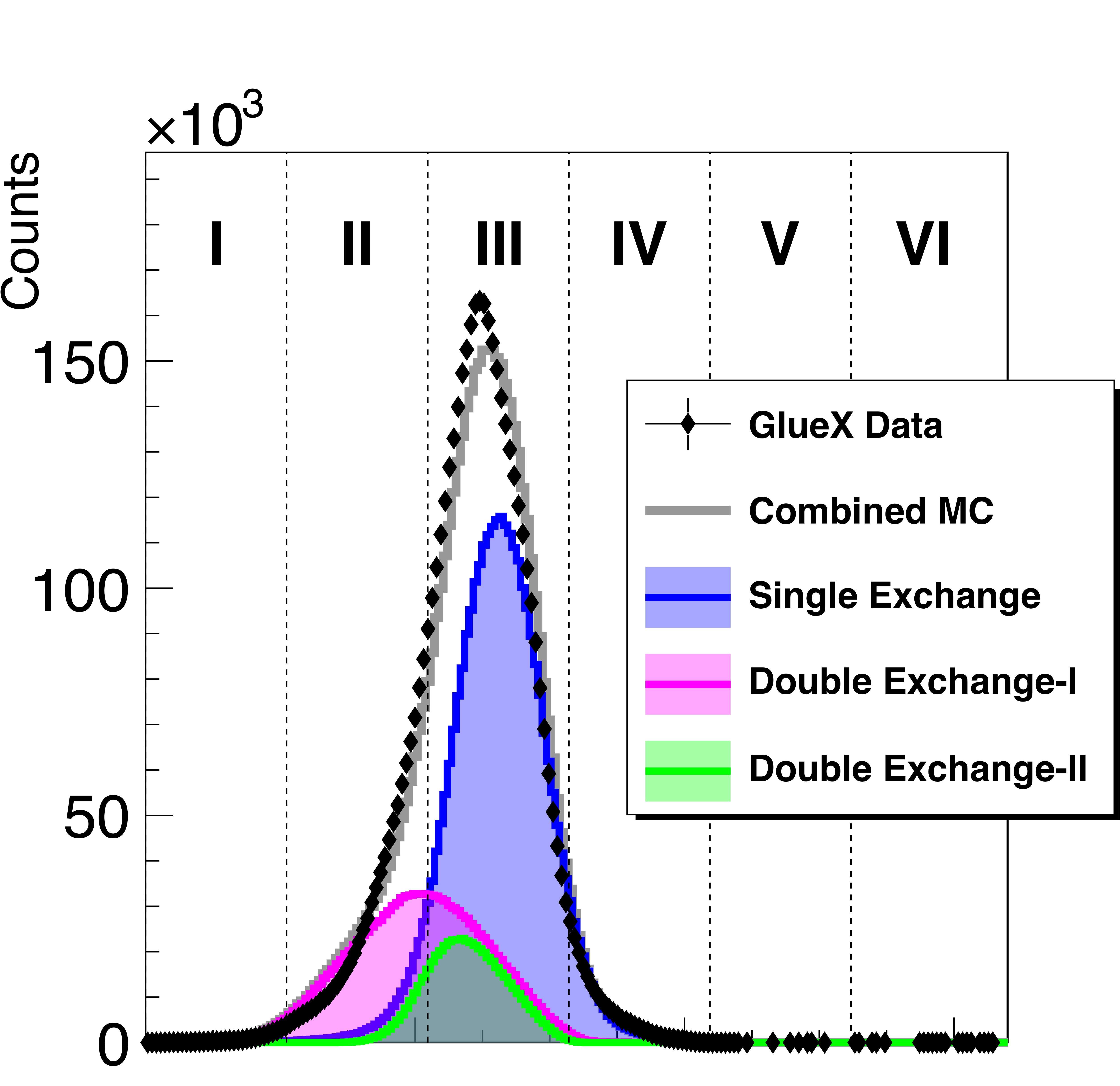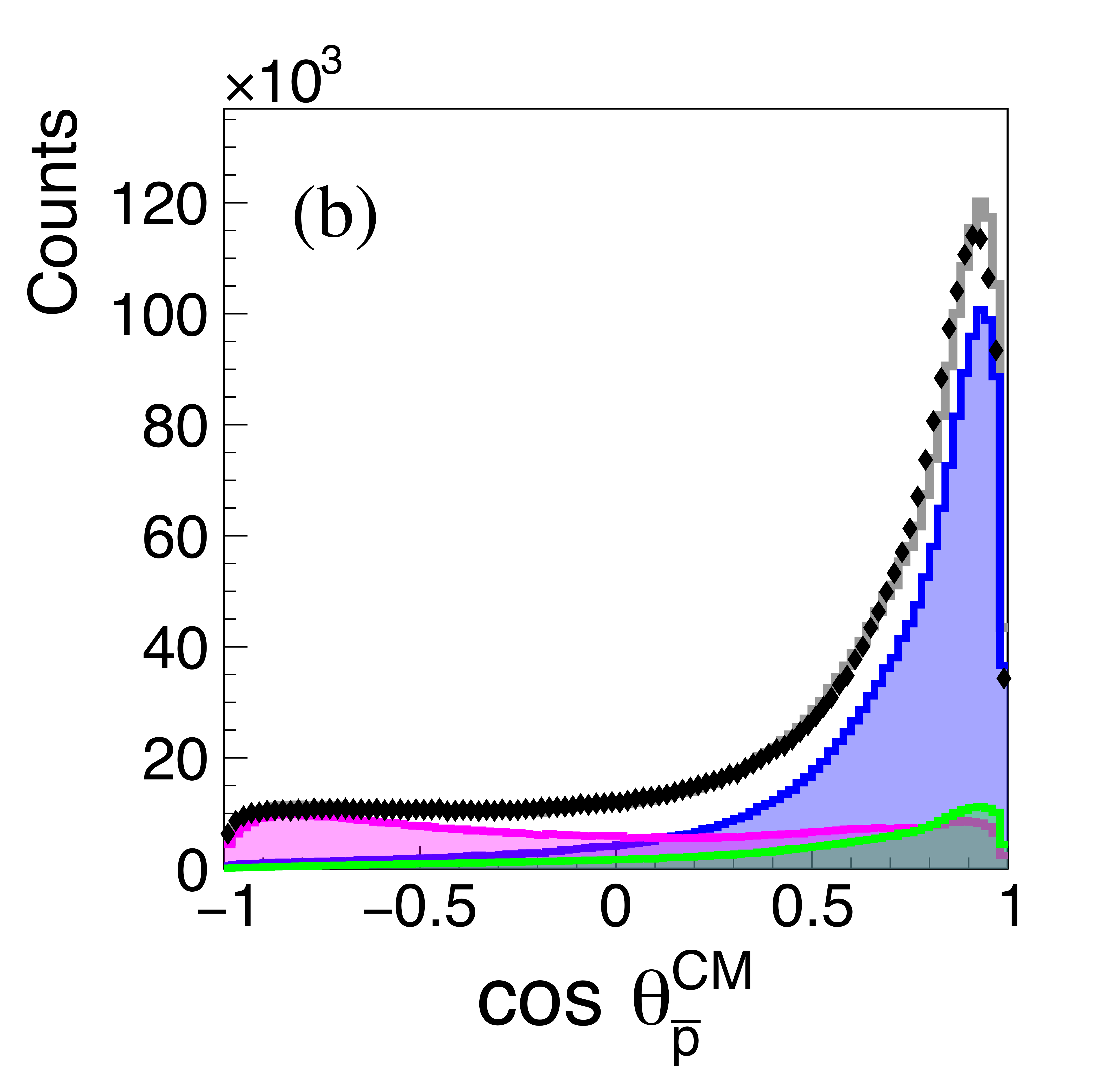 The angular distributions of the two protons (a), (c), and the anti-proton (b) in the $\gamma p \rightarrow p \bar{p} p $ reaction in the overall CM frame. Not acceptance corrected. The data are shown as black points and the summed simulation fit as a gray histogram. Components of the Monte Carlo simulations are shown as, Single Exchange (blue filled), Double Exchange-I (magenta filled), Double Exchange-II (green filled). |