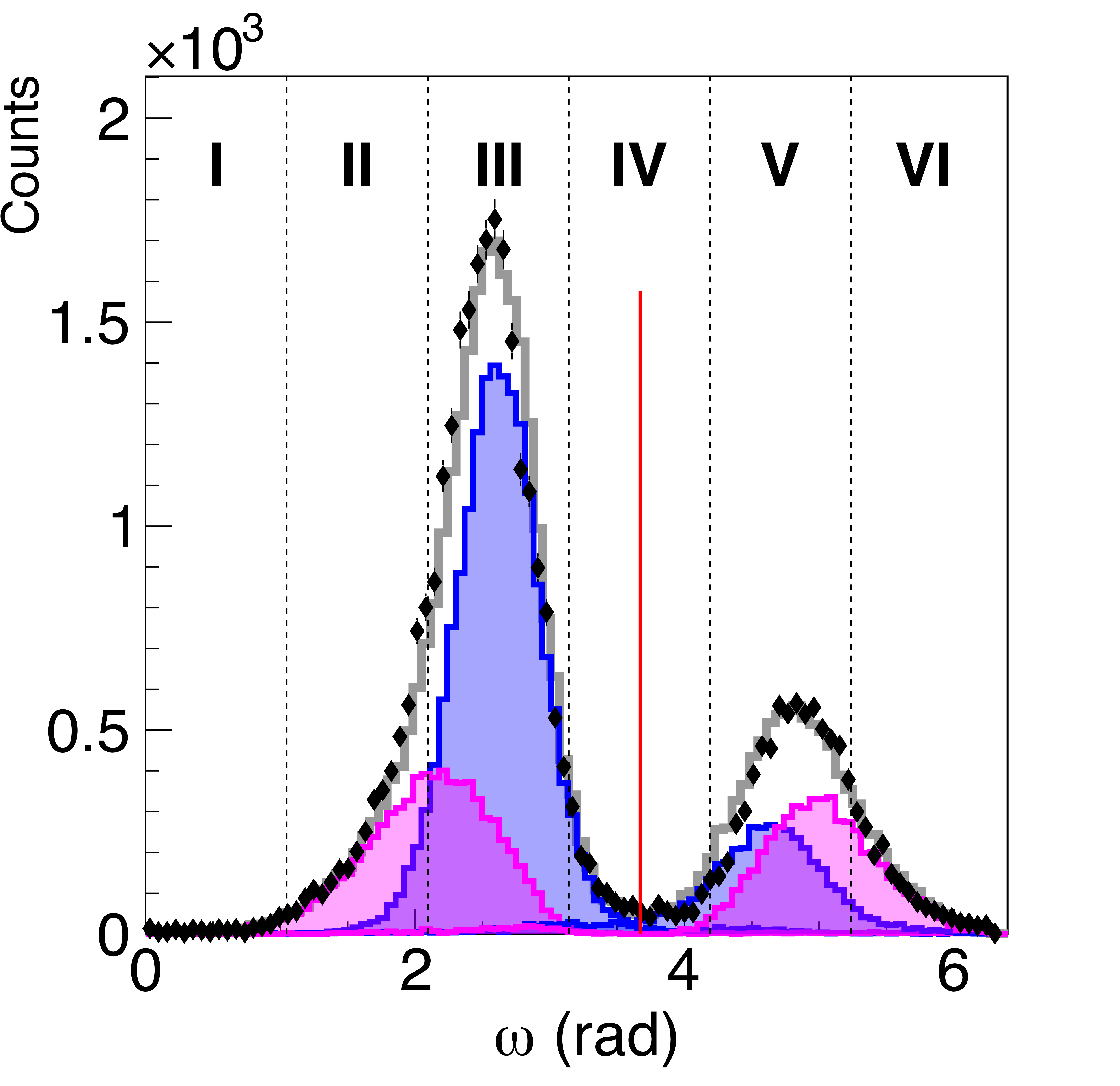 Van Hove distributions of the three-particle final states as a function of the angular parameter, $\omega$, that sorts the events according to pair longitudinal momenta. (Top) Data from the $p \bar{p} p$ reaction showing that most events are in Area III, corresponding to single exchange kinematics (blue in the model fit), but with significant overlap with events in the double exchange dominated region of Area II (magenta and green in the model fit). (Bottom) Data from the $\Lambda \bar{\Lambda} p$ reaction showing the division between $\{ \Lambda \bar{\Lambda} \} p $ events mainly in Areas II and III, and $\{ p \bar{\Lambda} \} \Lambda $ events mainly in Areas V and VI. The cut separating $\Lambda\bar{\Lambda}$ and $p\bar{\Lambda}$ cases is indicated by the solid red line at $\omega = 3.67$. |