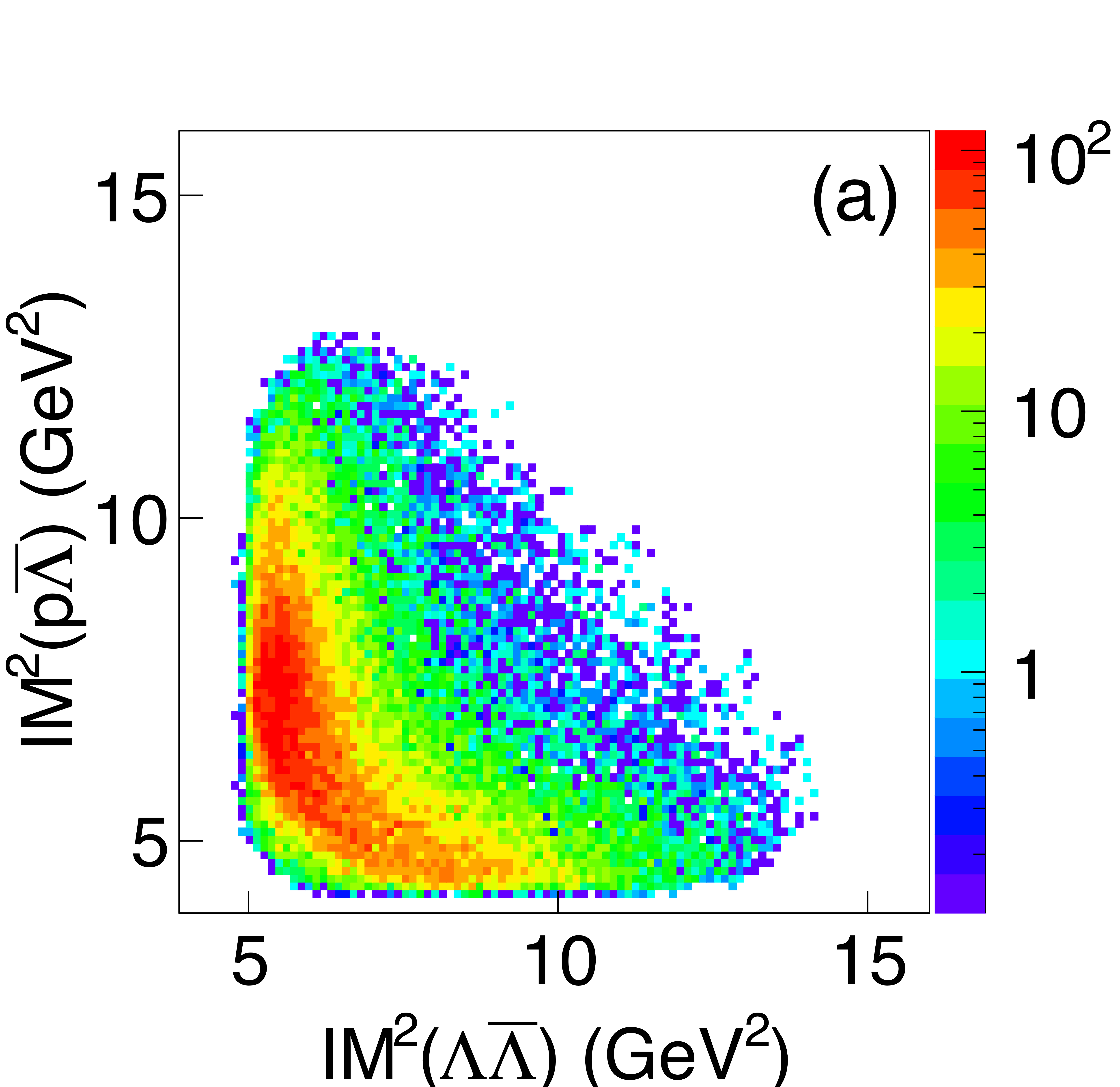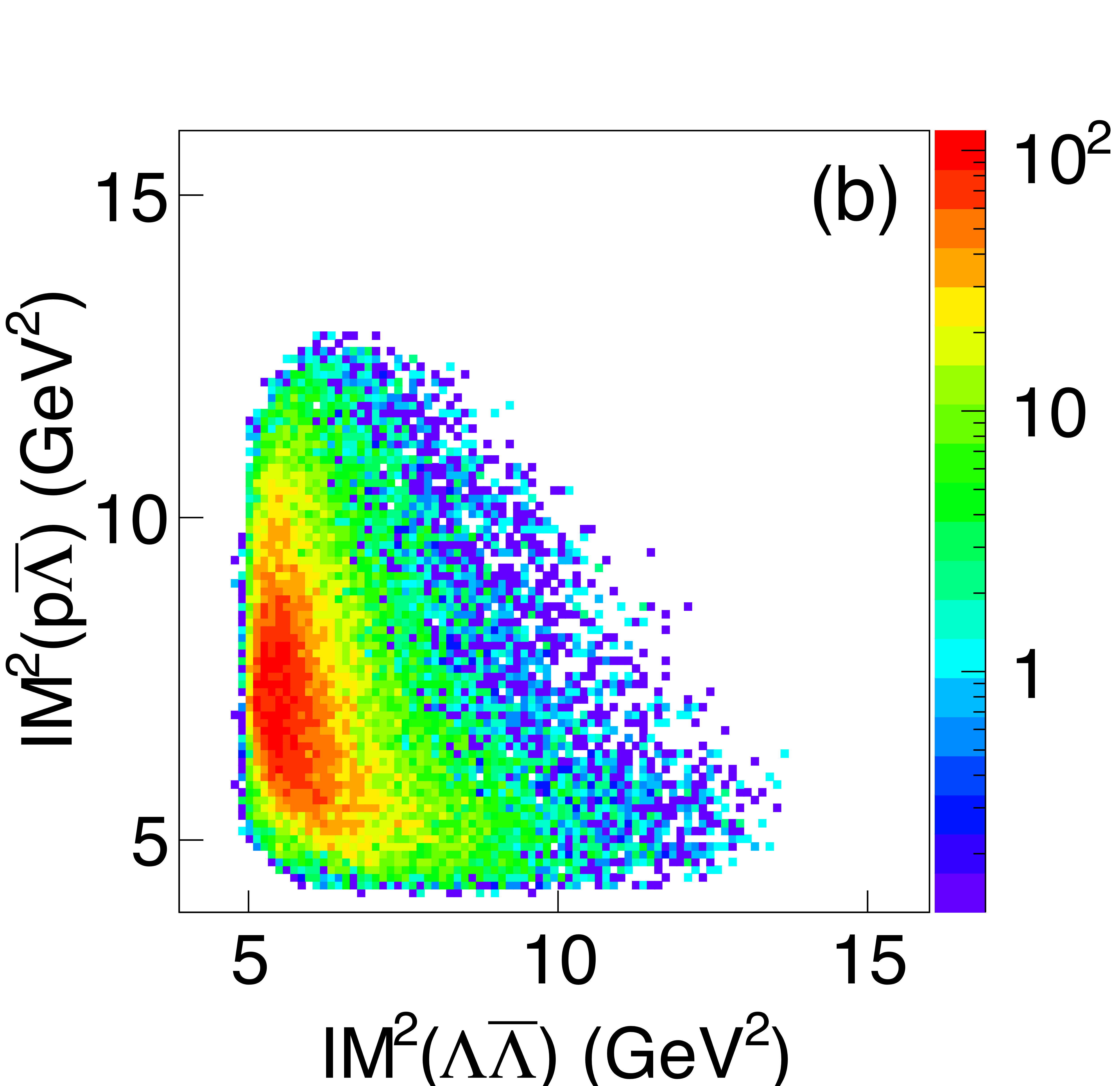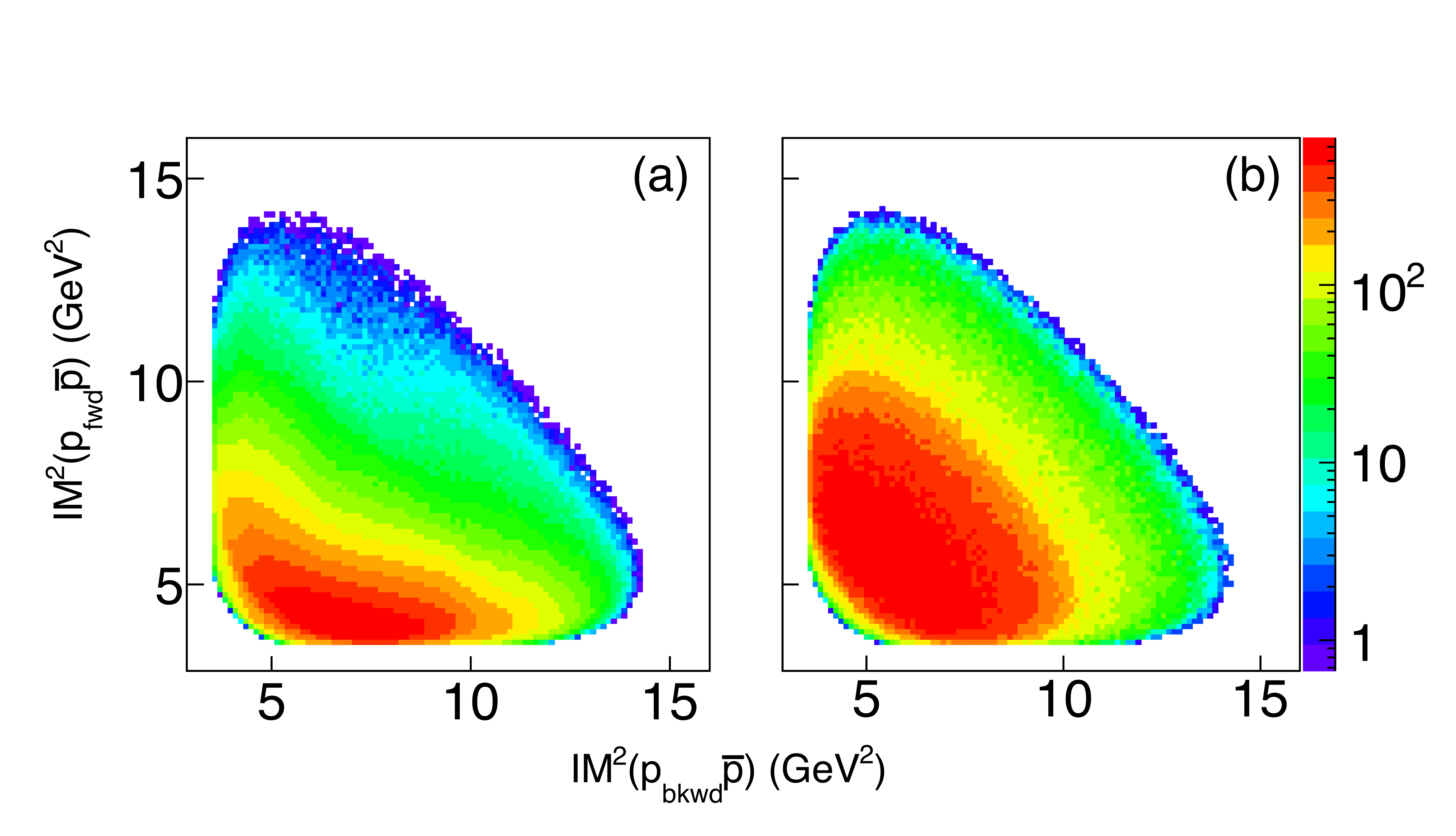 Dalitz plots for the $\gamma p \rightarrow \{p\bar{p}\} p$ reaction summed over the GlueX beam energy range. (a) GlueX data, without acceptance correction. (b) three-body phase space MC. |