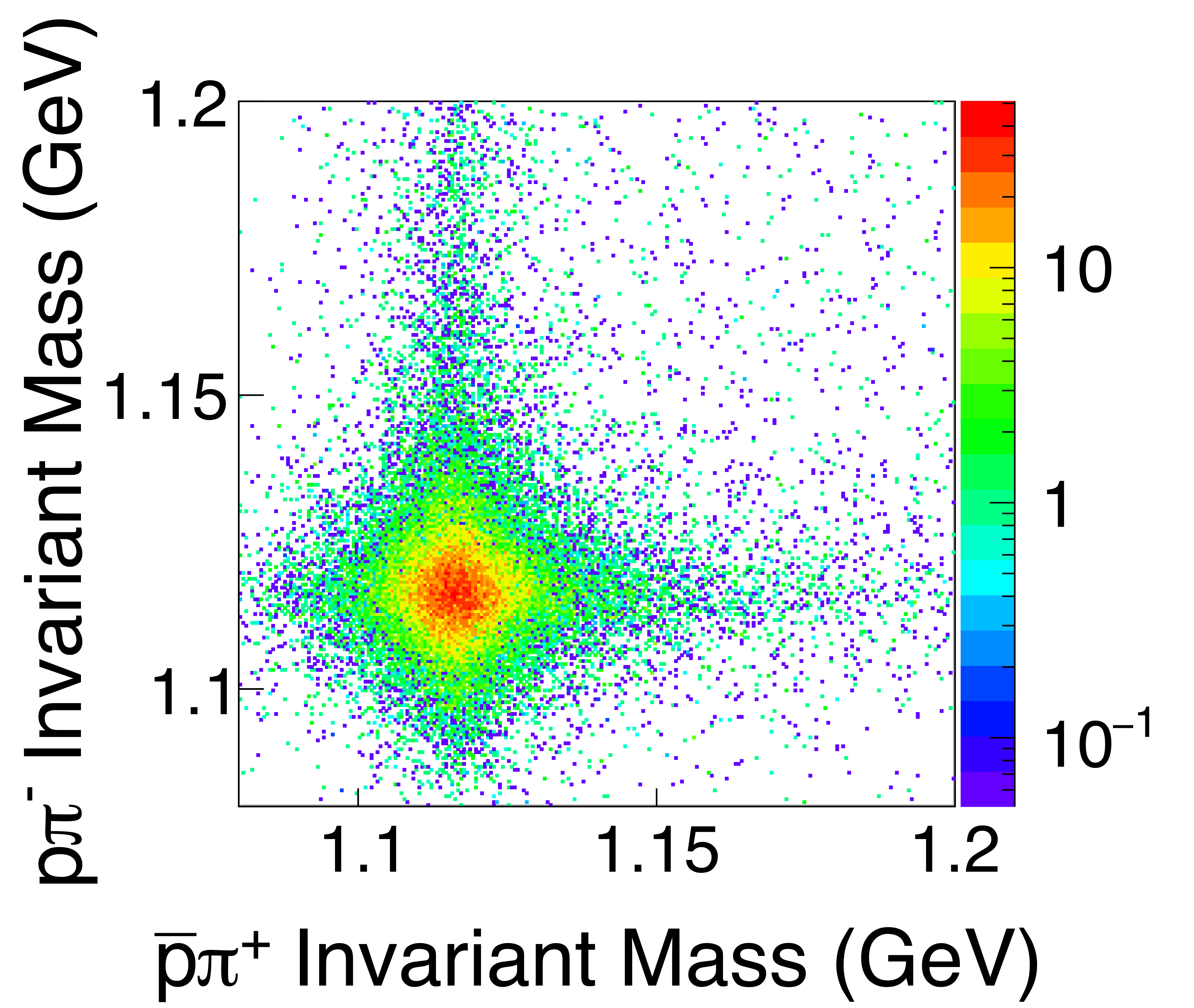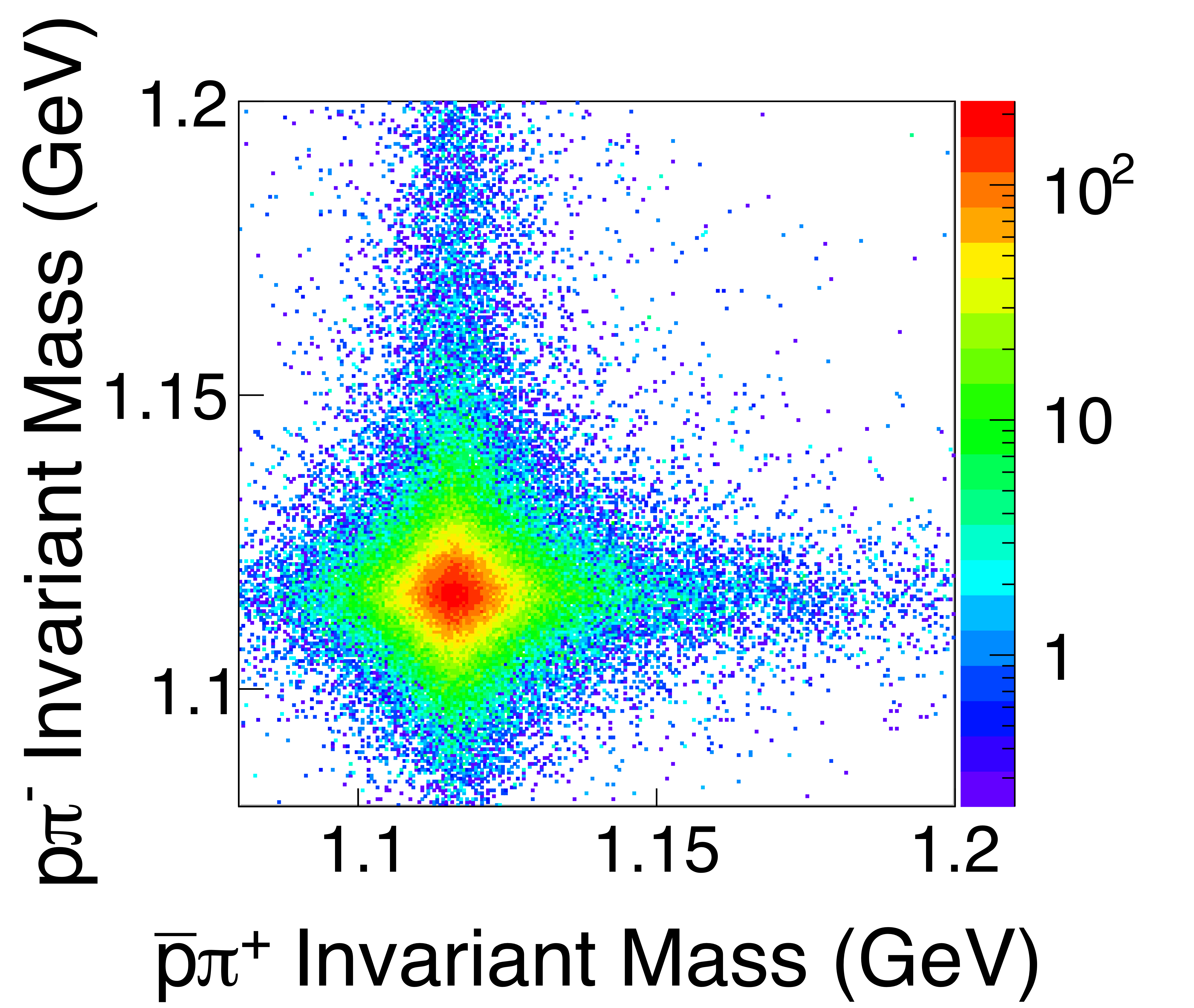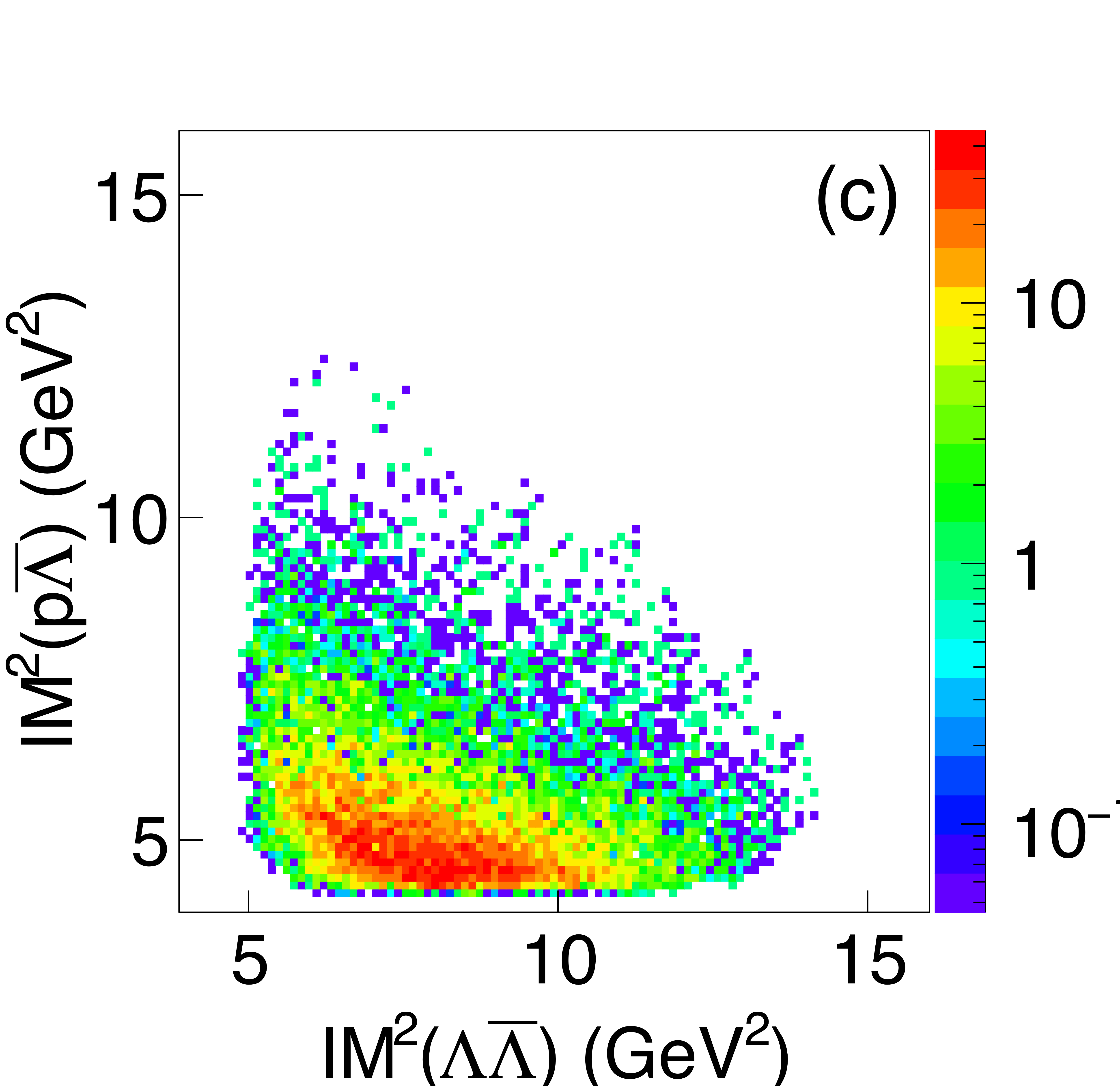 Dalitz plots for the $\gamma p \rightarrow \{p\bar{p}\} p$ reaction summed over the GlueX beam energy range. (a) GlueX data, without acceptance correction. (b) three-body phase space MC. |