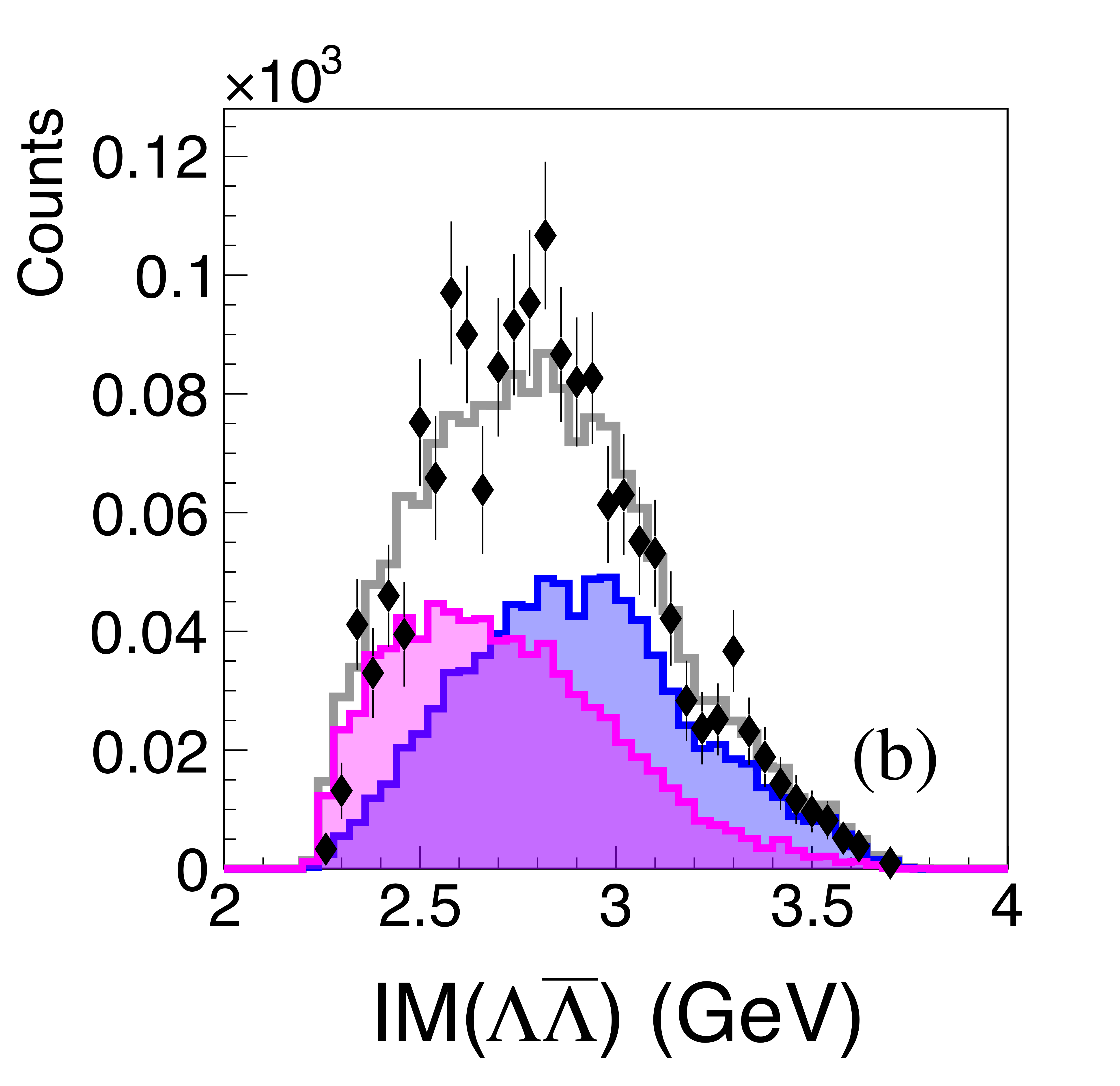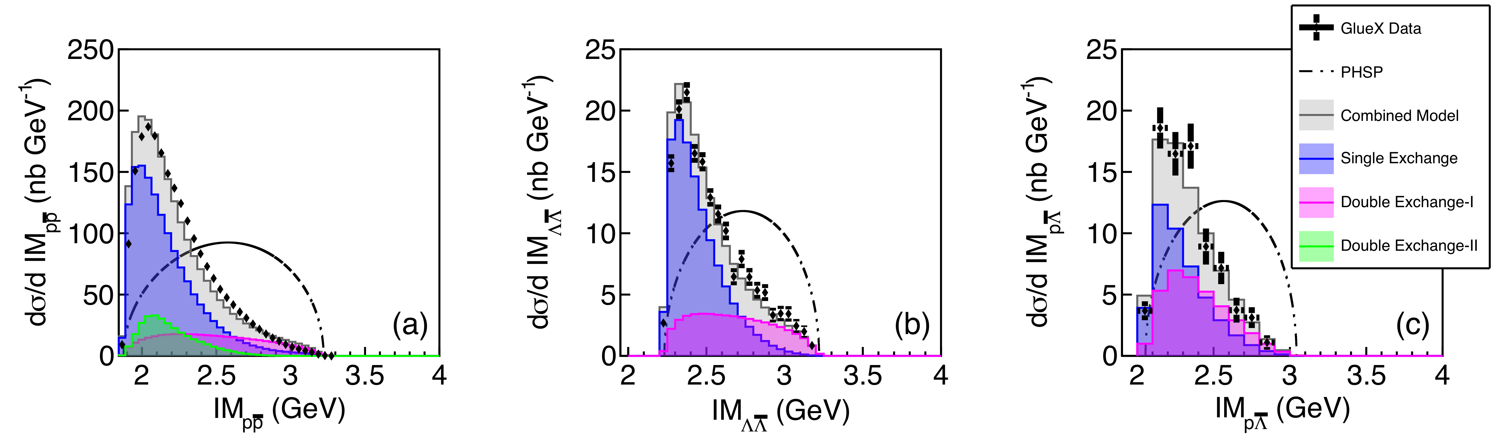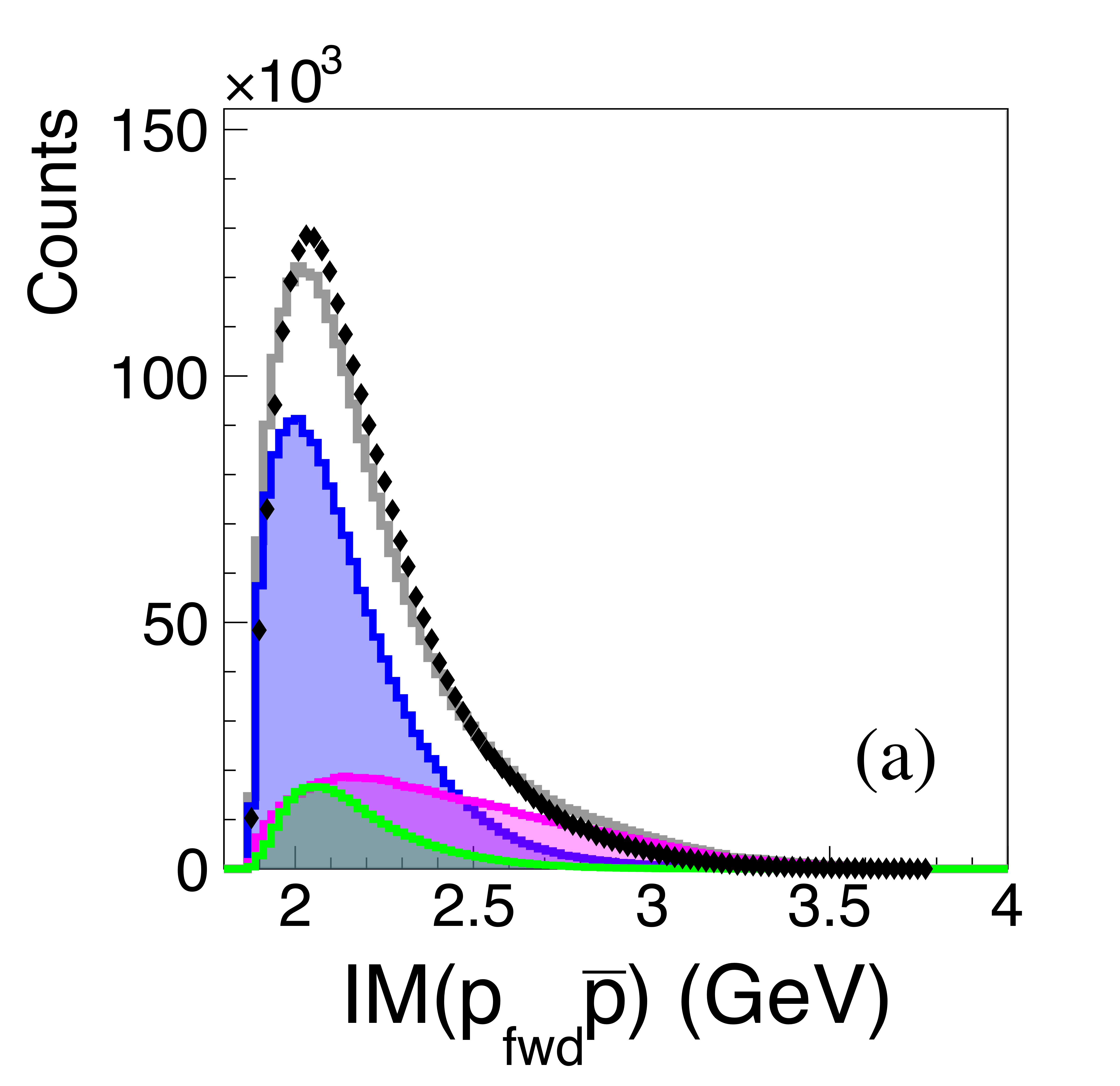 (a) Invariant mass of $p\bar{p}$ pairs for the more forward proton (black points), with model fits for the single exchange (blue) and double exchange (magenta and green) processes, totaling to the histogram (grey). (b) Pairings of the \bar{p}s with the more backward $p$. The distributions are not acceptance corrected. |