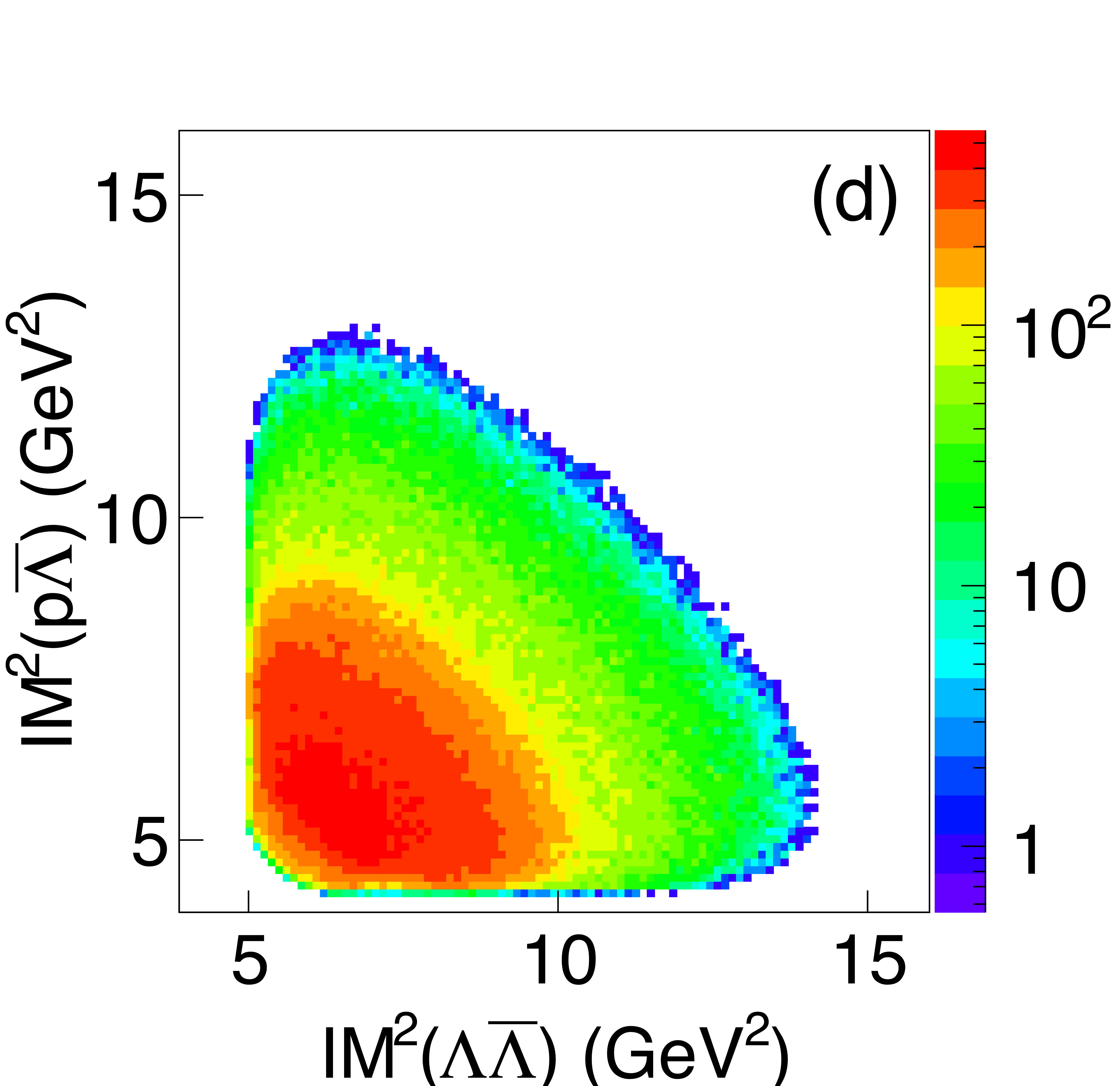 Dalitz plots for $\gamma p \rightarrow \Lambda\bar{\Lambda}p$ photoproduction for (a) GlueX data summed over the entire GlueX beam energy range, (b) data selected ($\omega<3.67$) for the case where $\Lambda\bar{\Lambda}$ system recoils against $p$, (c) data selected ($\omega>3.67$) for the case where $p\bar{\Lambda}$ system recoils against $\Lambda$ , and (d) three-body phase space MC. |
