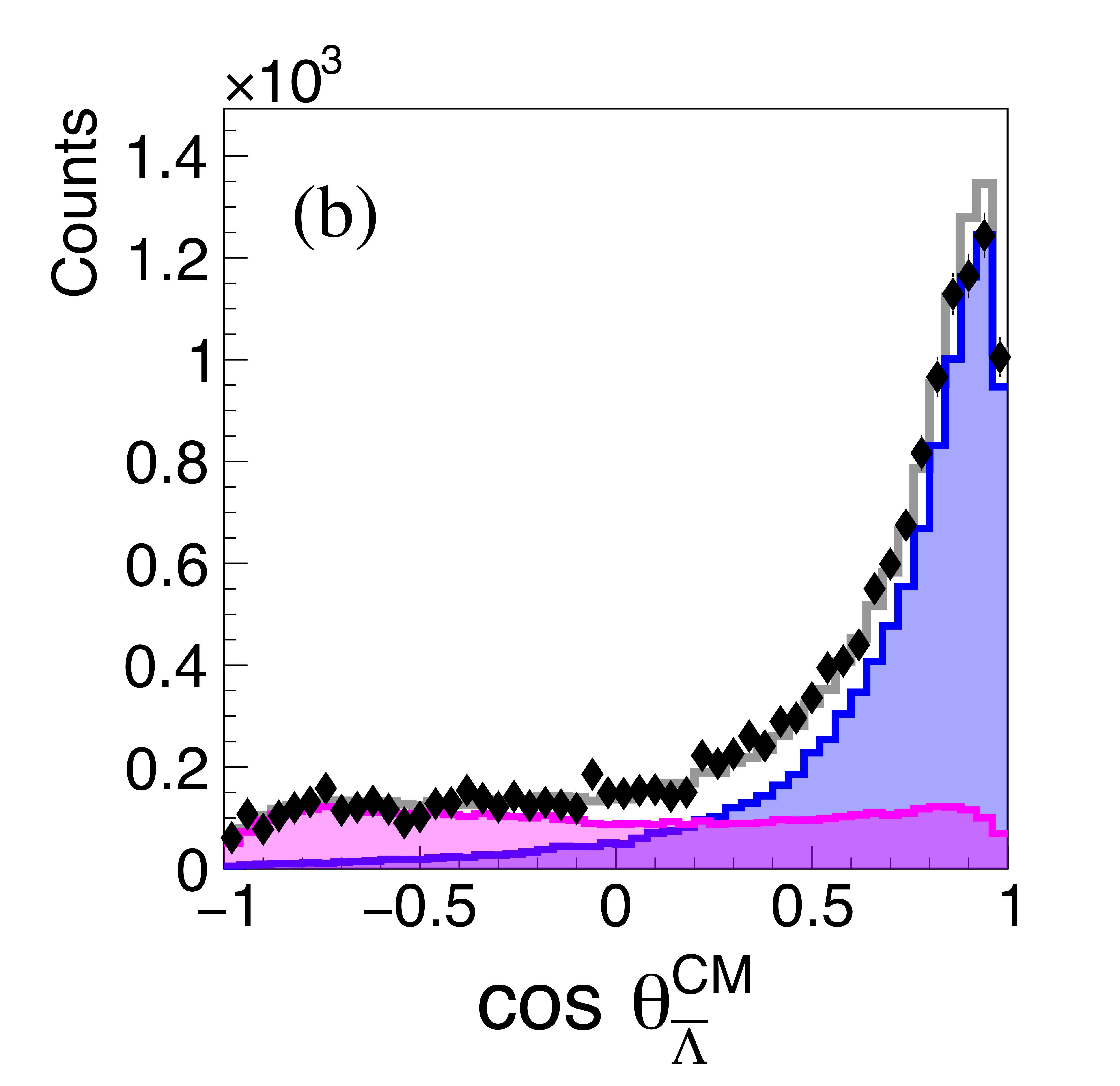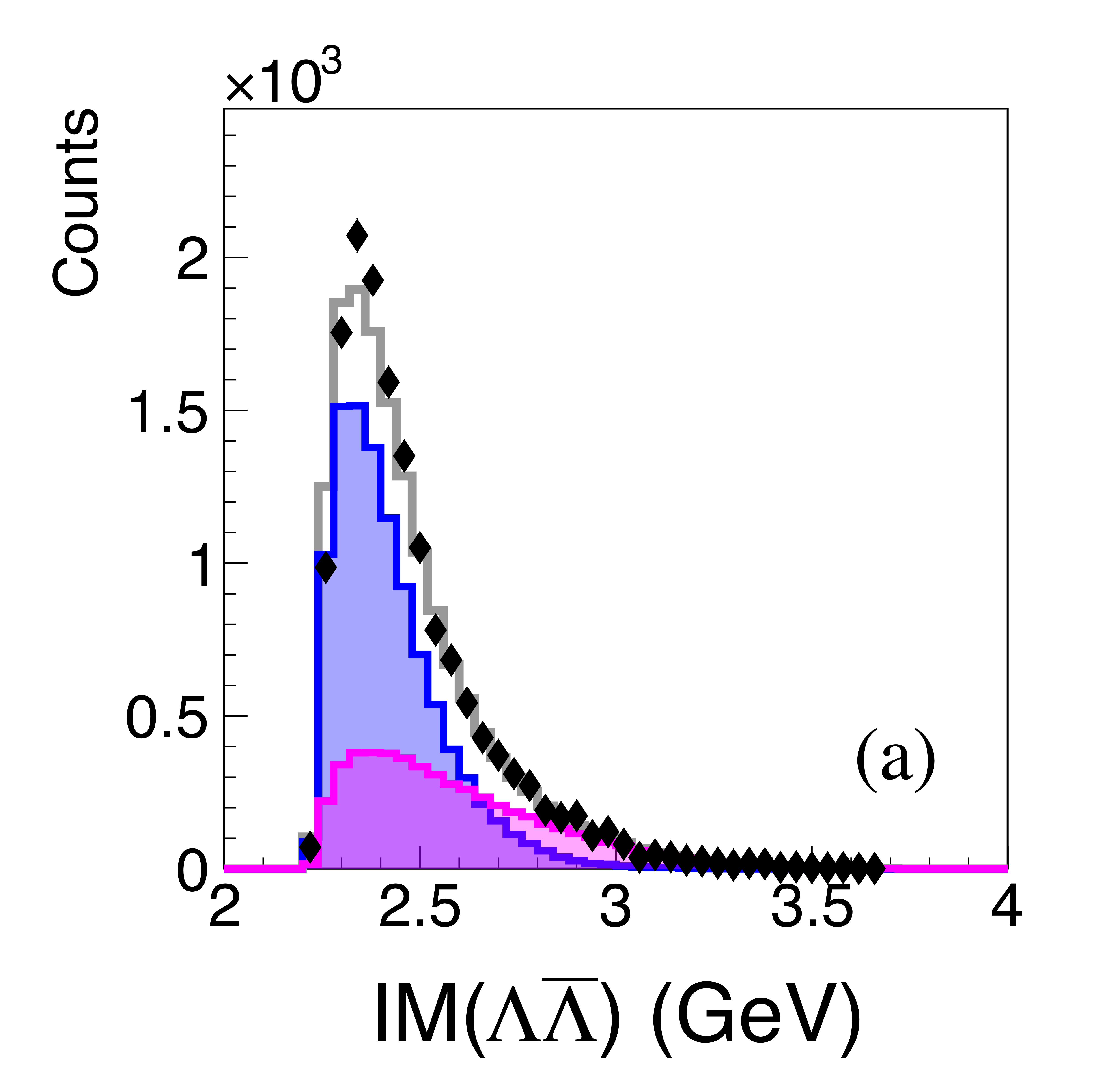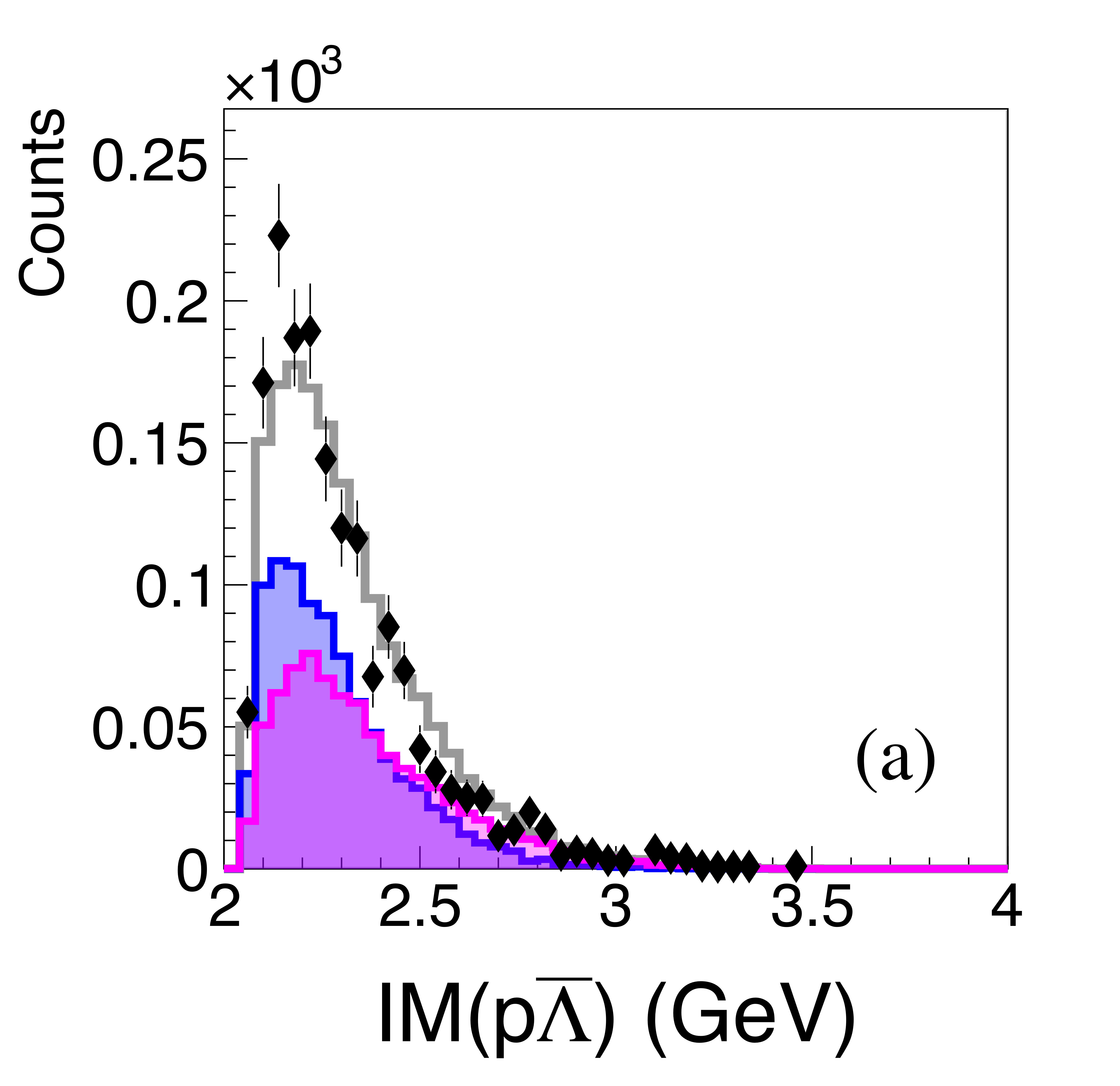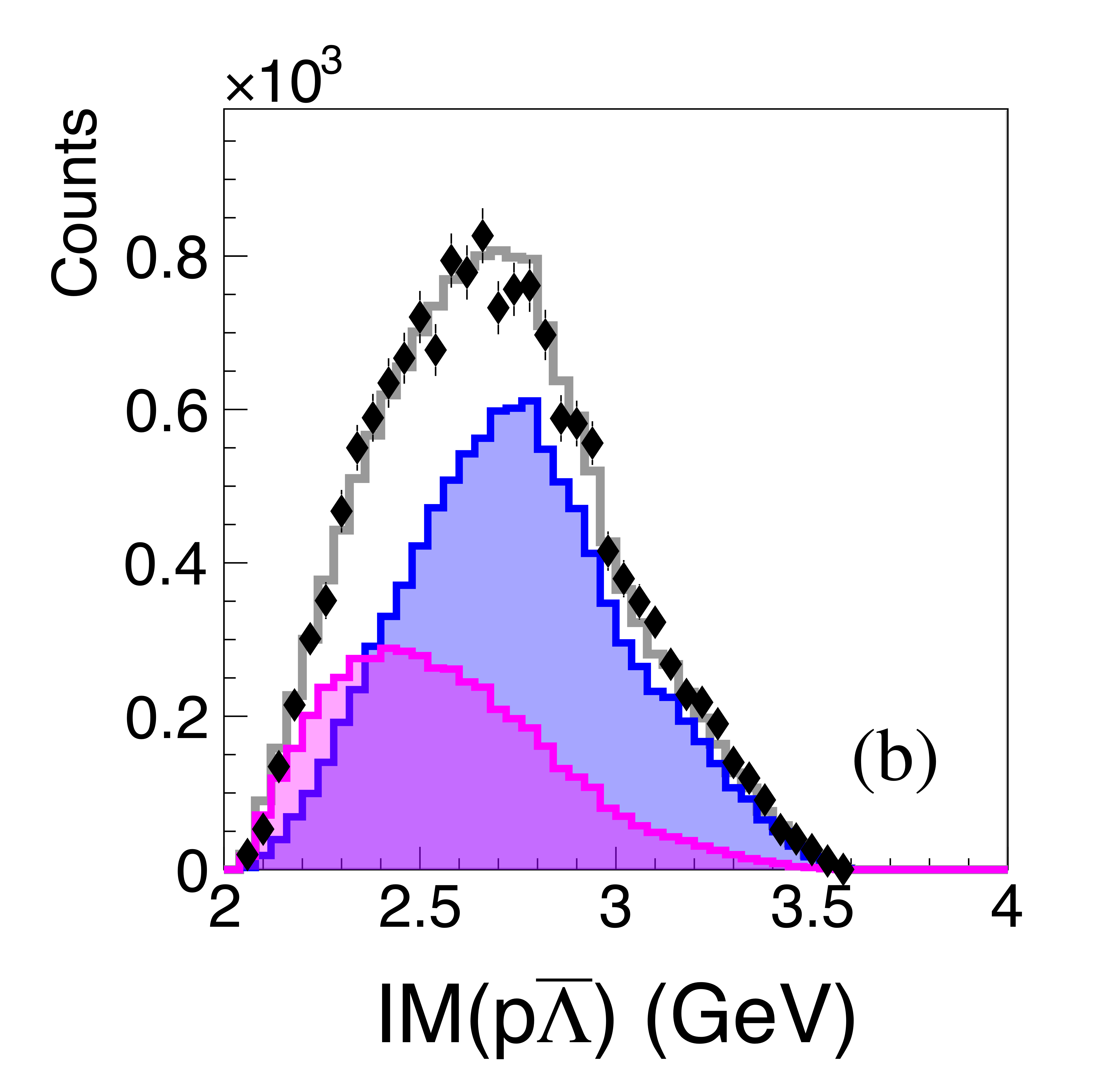(a) Invariant mass of $p\bar{\Lambda}$ pairs for the more forward proton (black points), together with model fits for the single exchange (blue) and double exchange (magenta) processes. (b) Pairings with the more backward proton. The distributions are not acceptance corrected. |