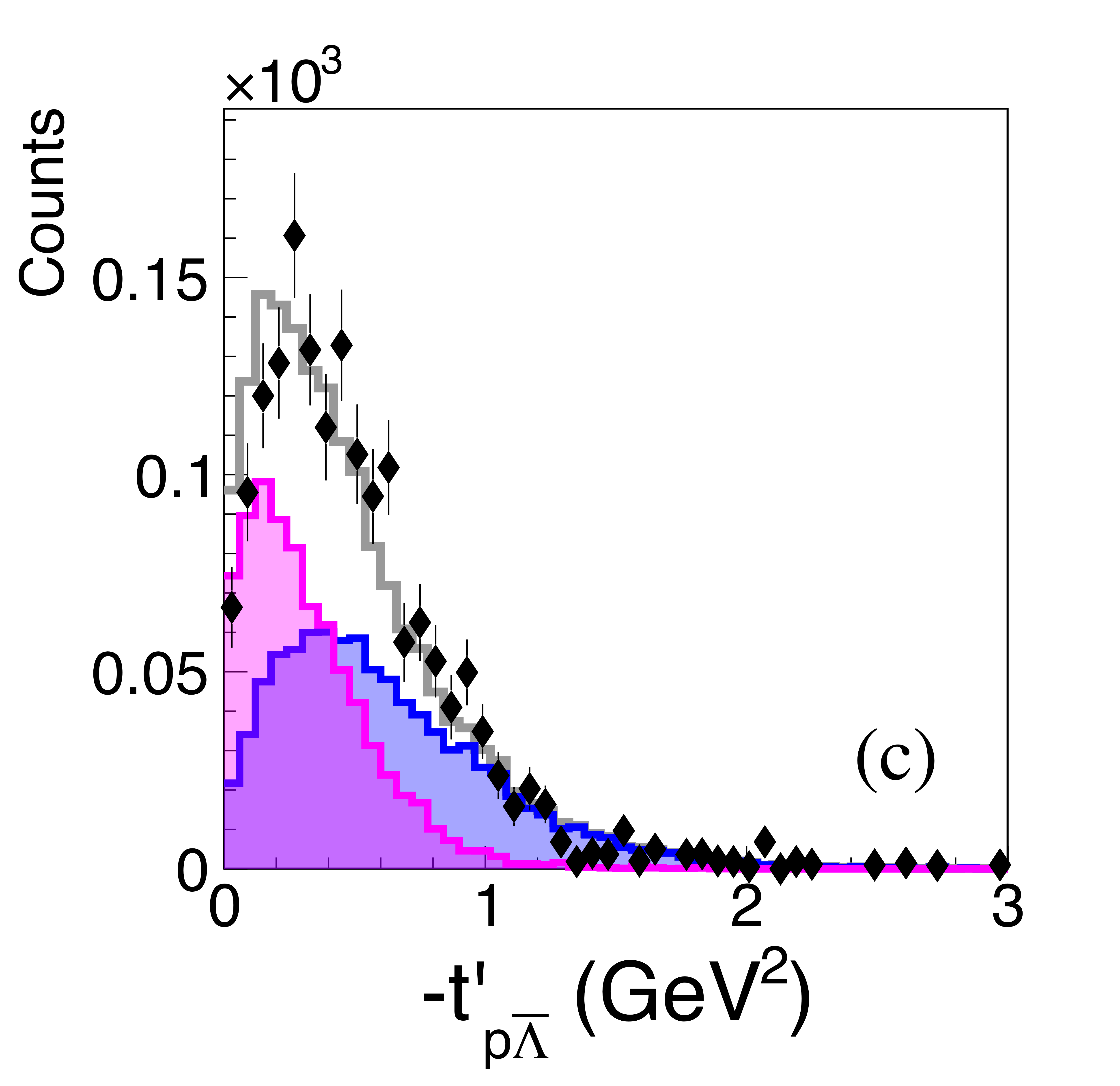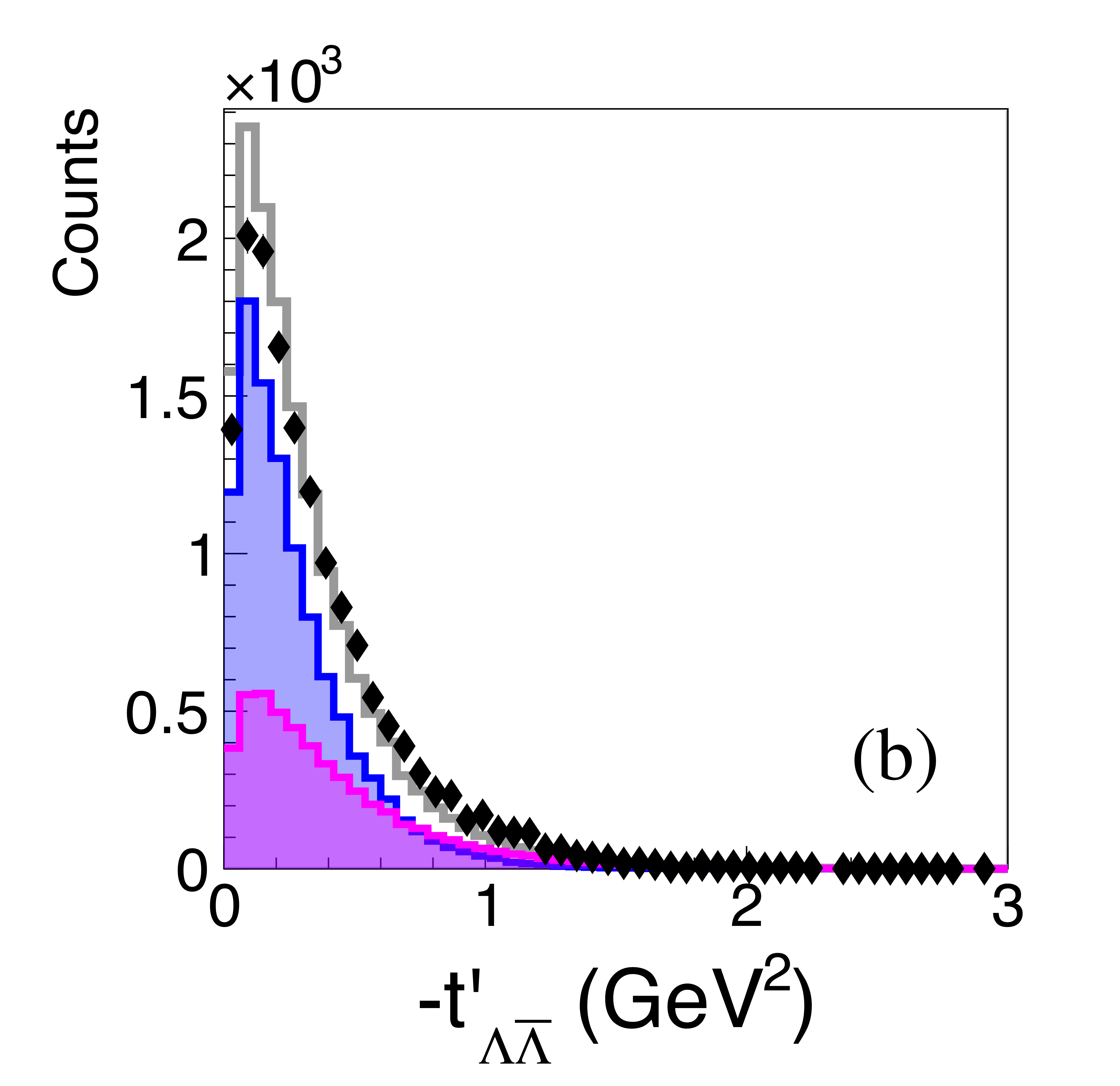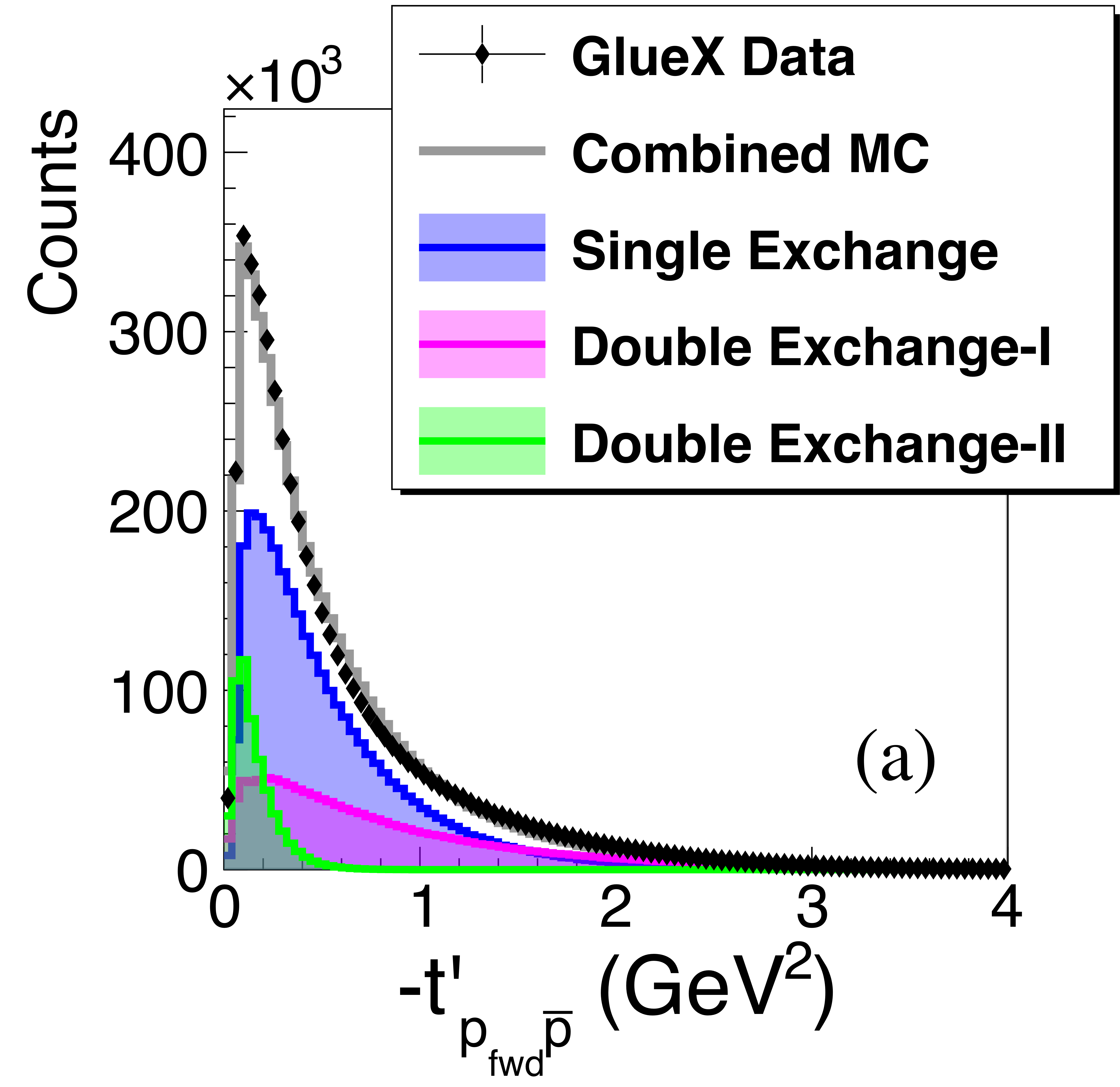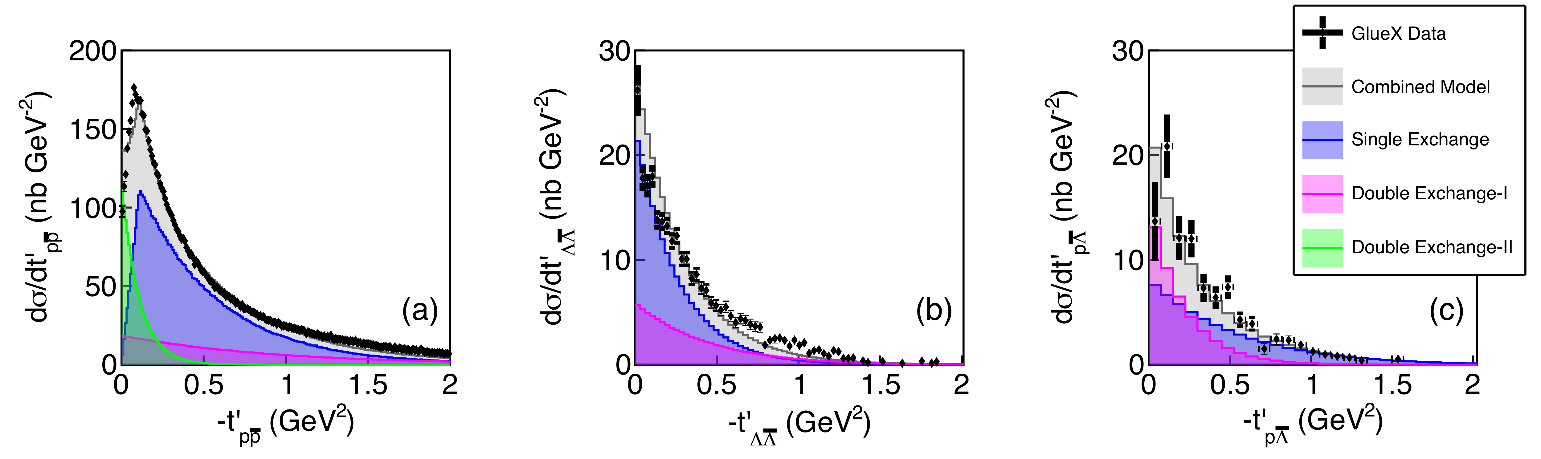 io Comparison between data and model distributions of the reduced 4-momentum transfer, $t^{\prime}$, from beam photon to the target proton (Eq. 16), summed over all beam energies. (a) $p\bar{p}$ pairs recoiling against $p$, (b) $\Lambda\bar{\Lambda}$ pairs recoiling against $p$, and (c) $p\bar{\Lambda}$ pairs recoiling against $\Lambda$. The model component colors are as in Fig. 7 These distributions are not acceptance corrected. |