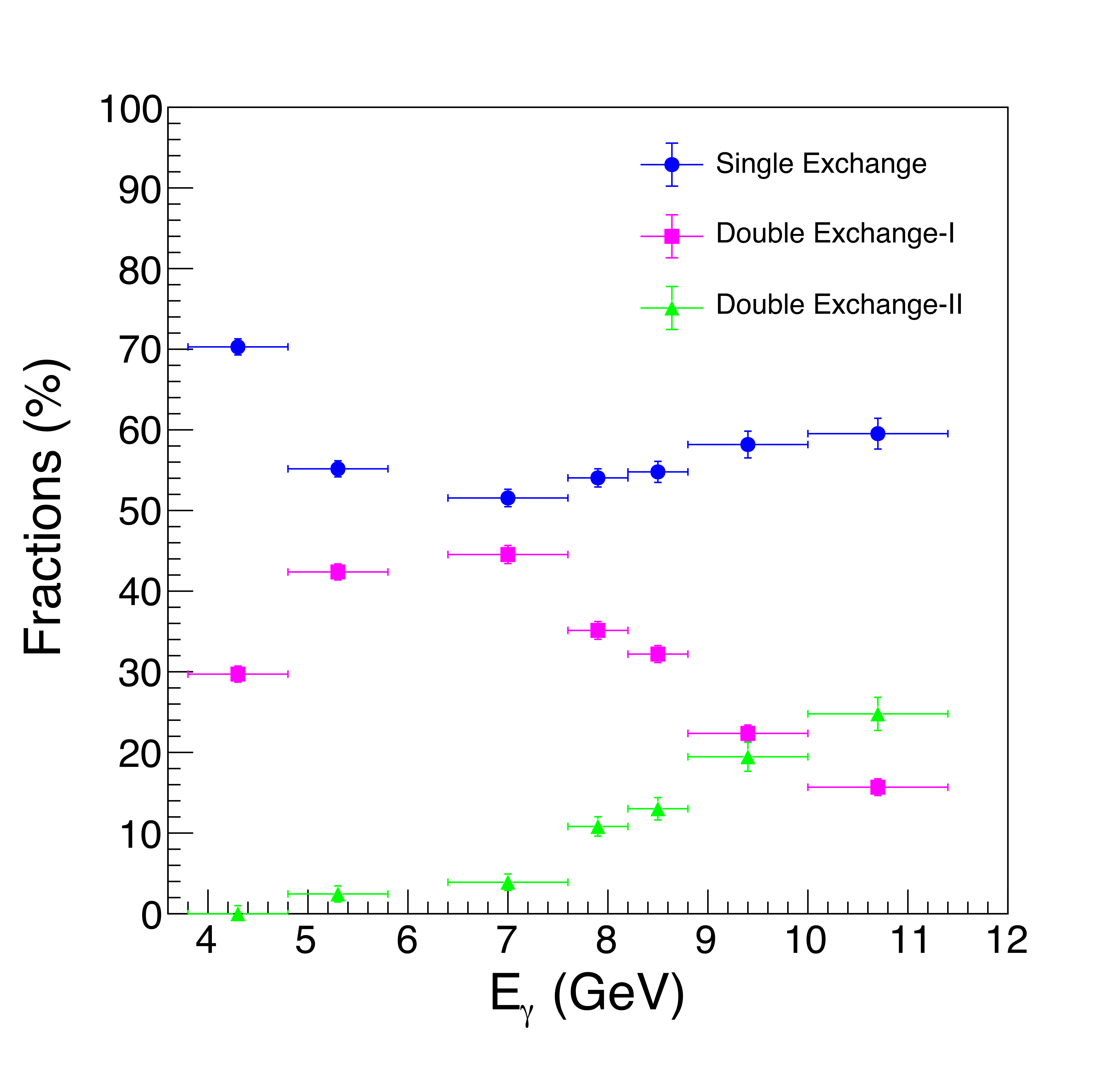 The proportions of the reaction mechanism components describing the $p\bar{p}$ photoproduction reaction as a function of beam energy, Single Exchange (blue), Double Exchange-I (magenta), and Double Exchange-II (green). |