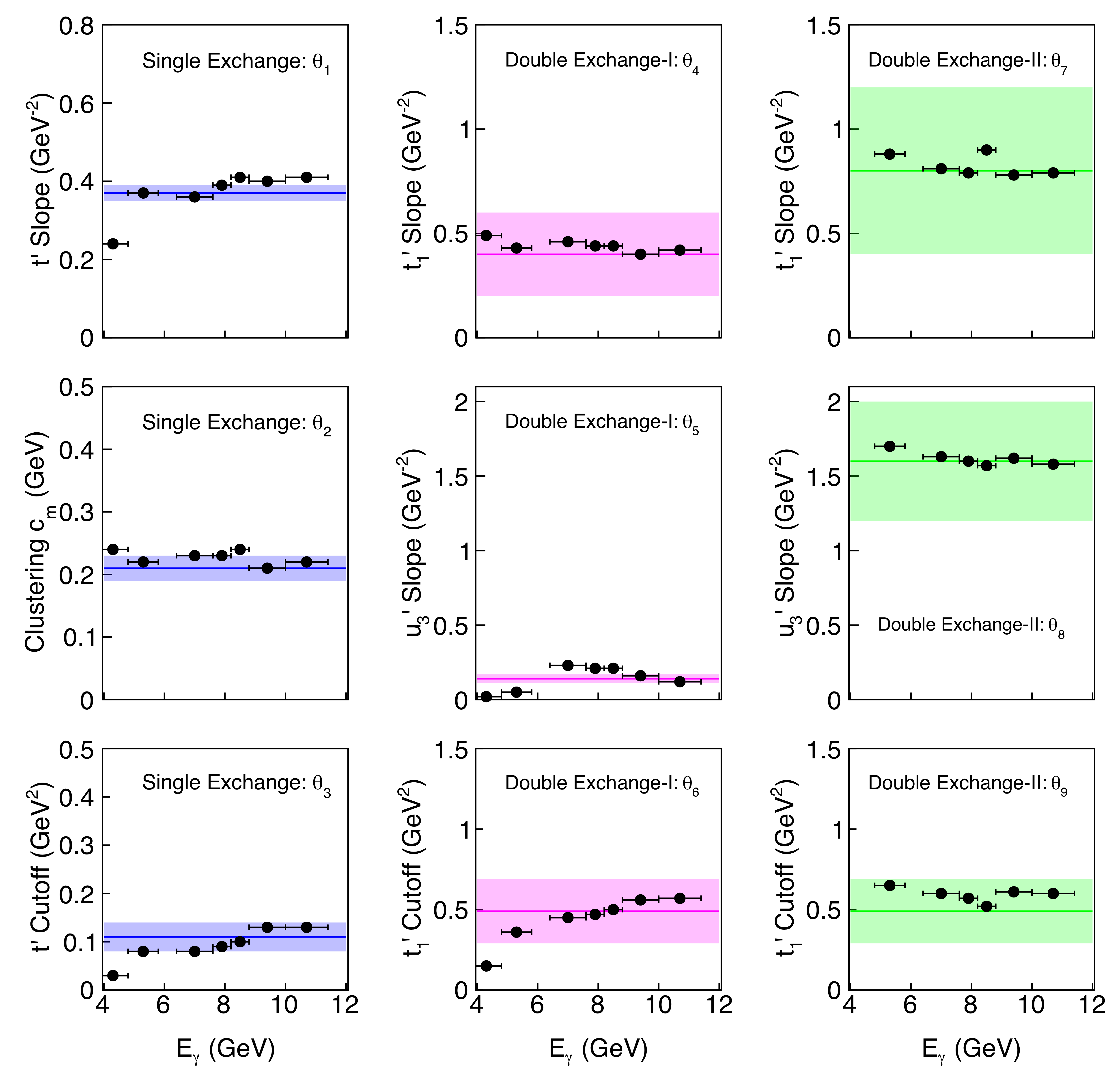 Beam energy dependence of the nine $p\bar{p}$ combined model parameters. Left column, ($\theta_1$, $\theta_2$, $\theta_3$) for the single exchange component, depicted in black solid circle markers. Middle column, Double Exchange-I ($\theta_4$, $\theta_5$, $\theta_6$). Right column, Double Exchange-II ($\theta_7$, $\theta_8$, $\theta_9$). The colored bands summarize the global fit values and the estimated global fit uncertainties from Table I for the whole GlueX energy range. |
