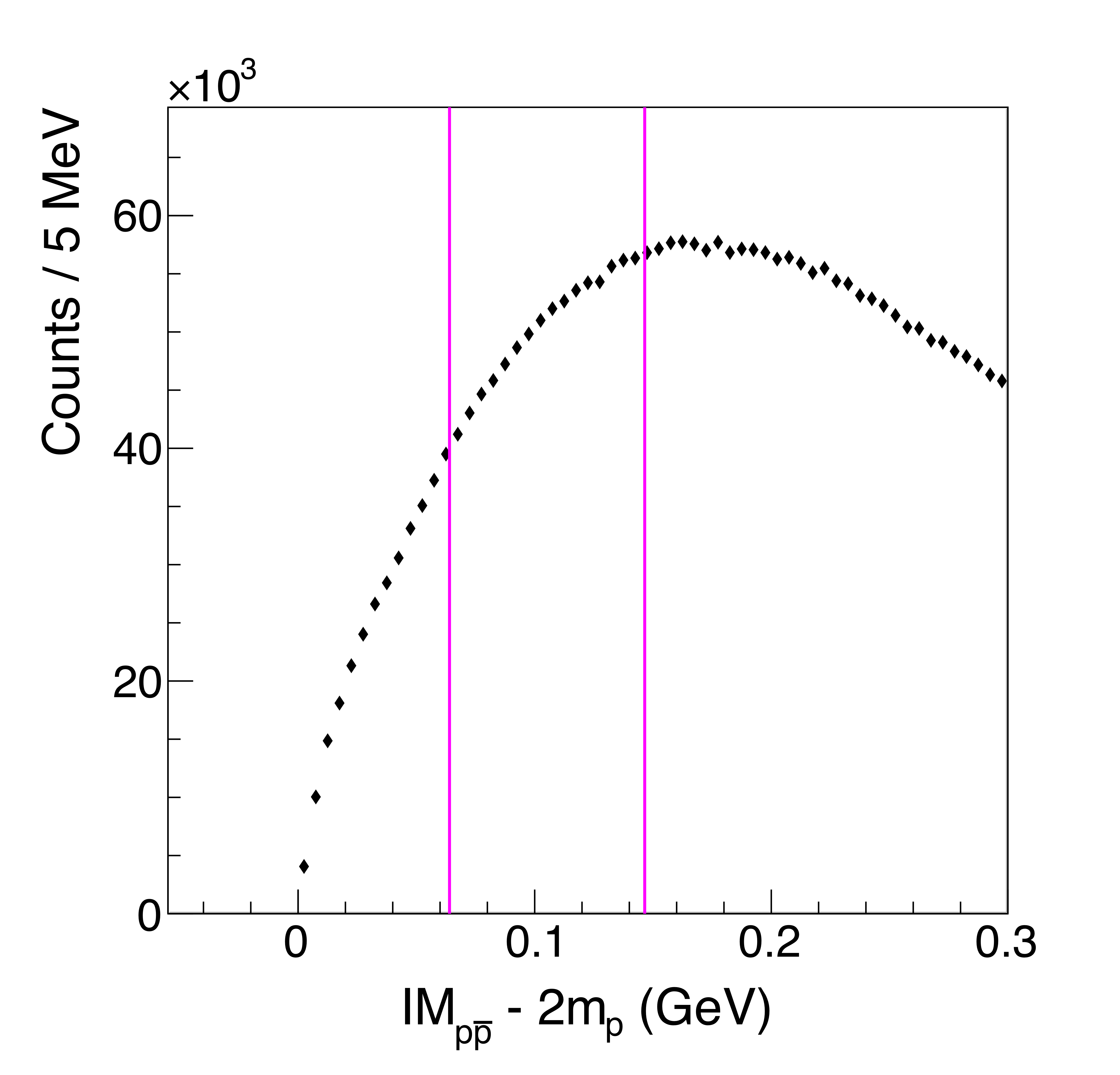 Events per 5 MeV mass bin versus $p\bar{p}$ invariant mass for diffractively created pairs. The GlueX mass resolution for the forward-going $p\bar{p}$ system is $3-5$ MeV in this region. The threshold mass of $2m_p$ is subtracted. The vertical magenta lines indicate where previous measurements (DESY \cite{Bodenkamp,1984dg}) suggested that narrow peaks may occur. |