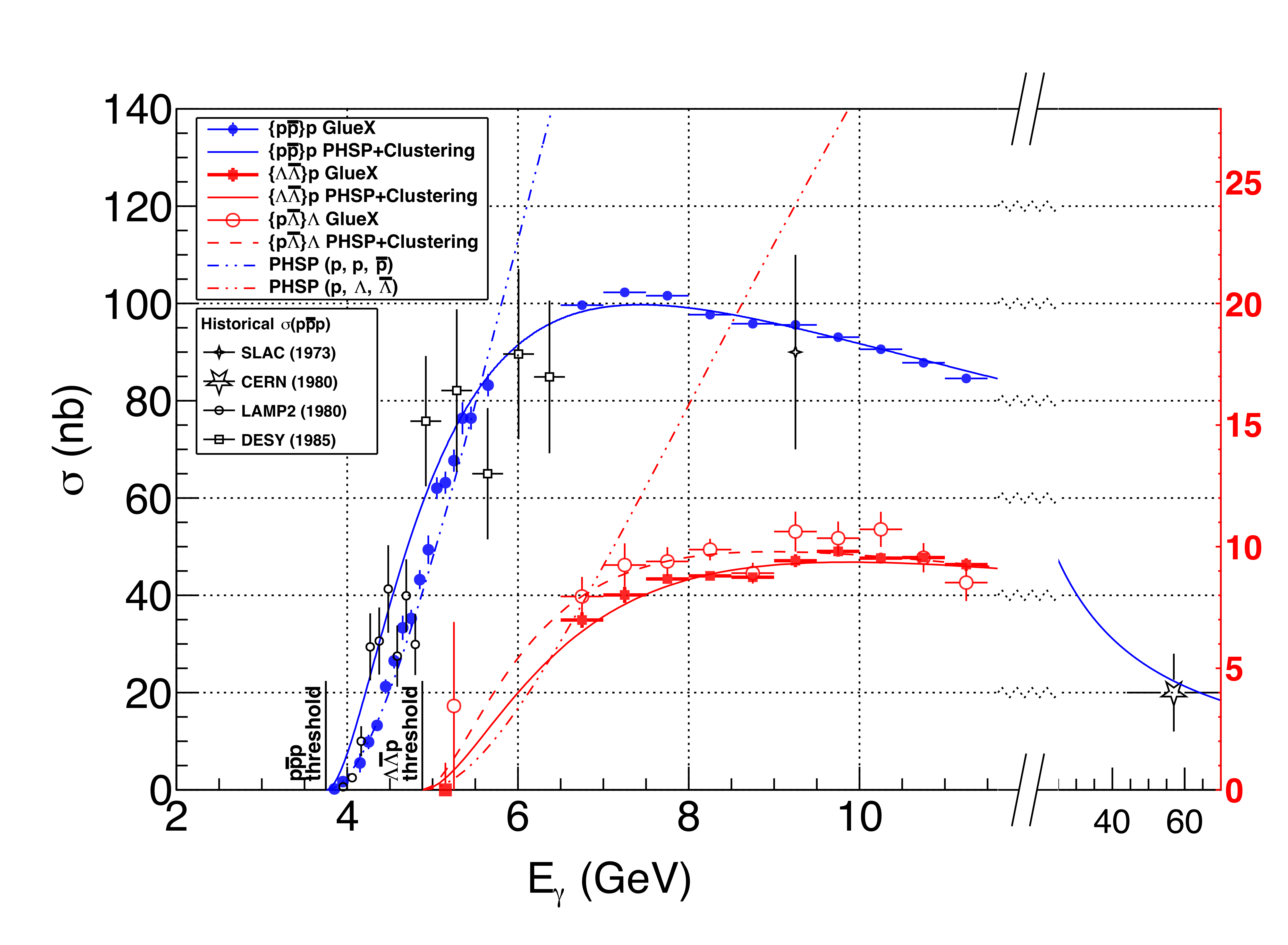 Total photoproduction cross sections off the proton, as a function of beam energy, for the $\{$p\bar{p}$\}$ (blue circles), $\{ \Lambda\bar{\Lambda} \}$(red squares), and $\{p \bar{\Lambda}\}$ (open red circles) systems. The red axis on the right corresponds to the red data points and curves in the figure, while the black axis on the left corresponds to all other data points and curves. The error bars show the statistical uncertainties only. Comparison is made to a selection of previous $\{$p\bar{p}$\}$ measurements from Daresbury (open circles) \cite{Barber,1979ah}, DESY \cite{Bodenkamp,1984dg} (open squares), SLAC \cite{Bingham,1973fu} (4-point star) and CERN \cite{Aston,1980gri} (5-point star). The curves represent the behavior of the total cross section modeled with the simplified picture (Eq. 16), for each reaction channel, $p\bar{p}$ (solid blue), $\Lambda\bar{\Lambda}$ (solid red), and ${p \bar{\Lambda}}$ (dashed red). The blue model curve for the $p\bar{p}$ channel also includes an extrapolation to the high energy datum from CERN. As a reference, the dotted-dashed curves illustrate integrated 3-body phase space (Eq. A13) for the $pp\bar{p}$ (blue) and $p\Lambda\bar{\Lambda}$ (red) final states. |