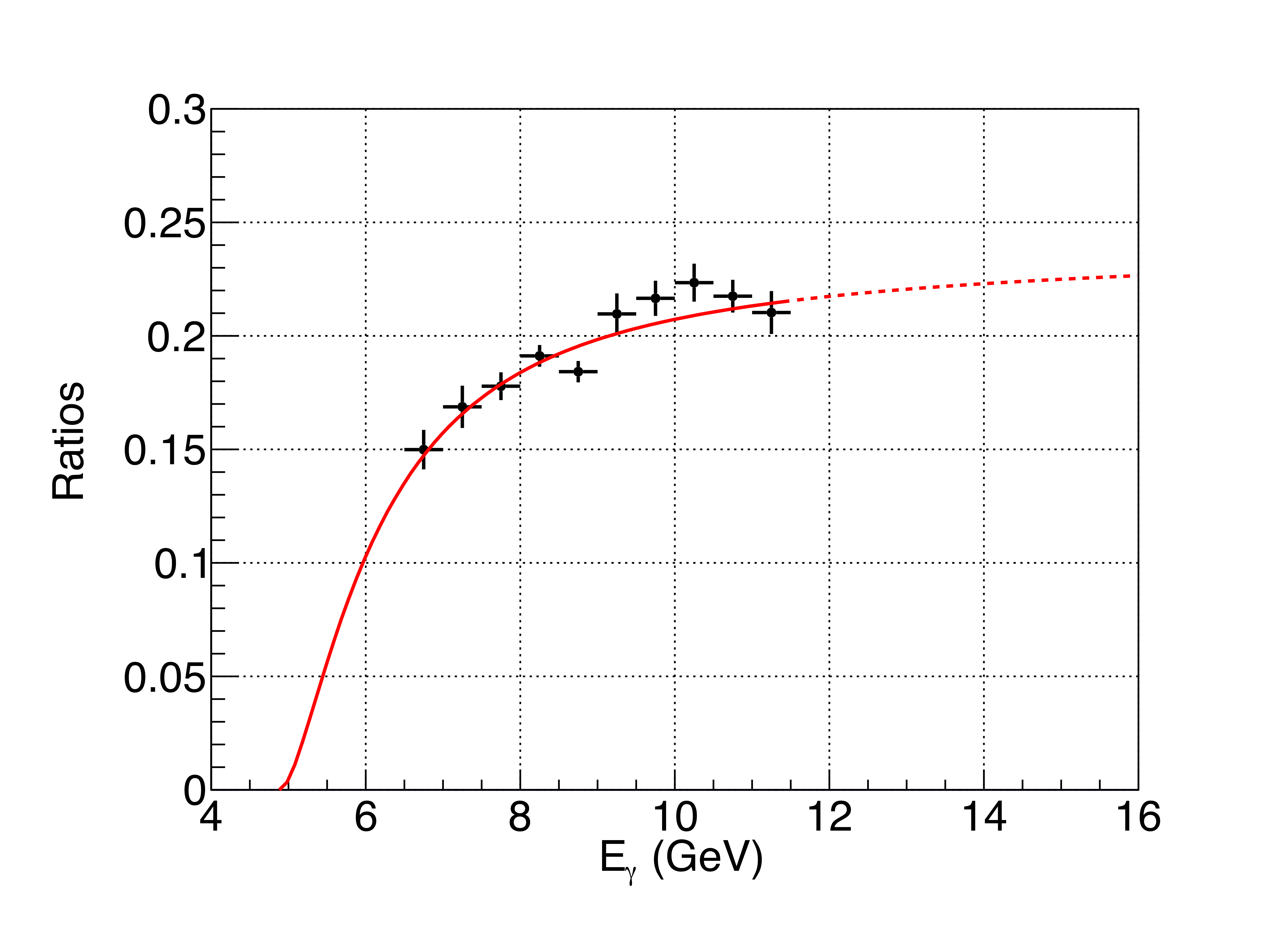 Comparison of the total cross section measurement ratios. Data points show the ratio between strange (sum of the $\Lambda\bar{\Lambda}$ and $p\bar{\Lambda}$ production) and non-strange ($p\bar{p}$) production cross sections; the red line depicts the computed ratio using our total cross section calculations. The dotted line is an extrapolation to unmeasured energies. |