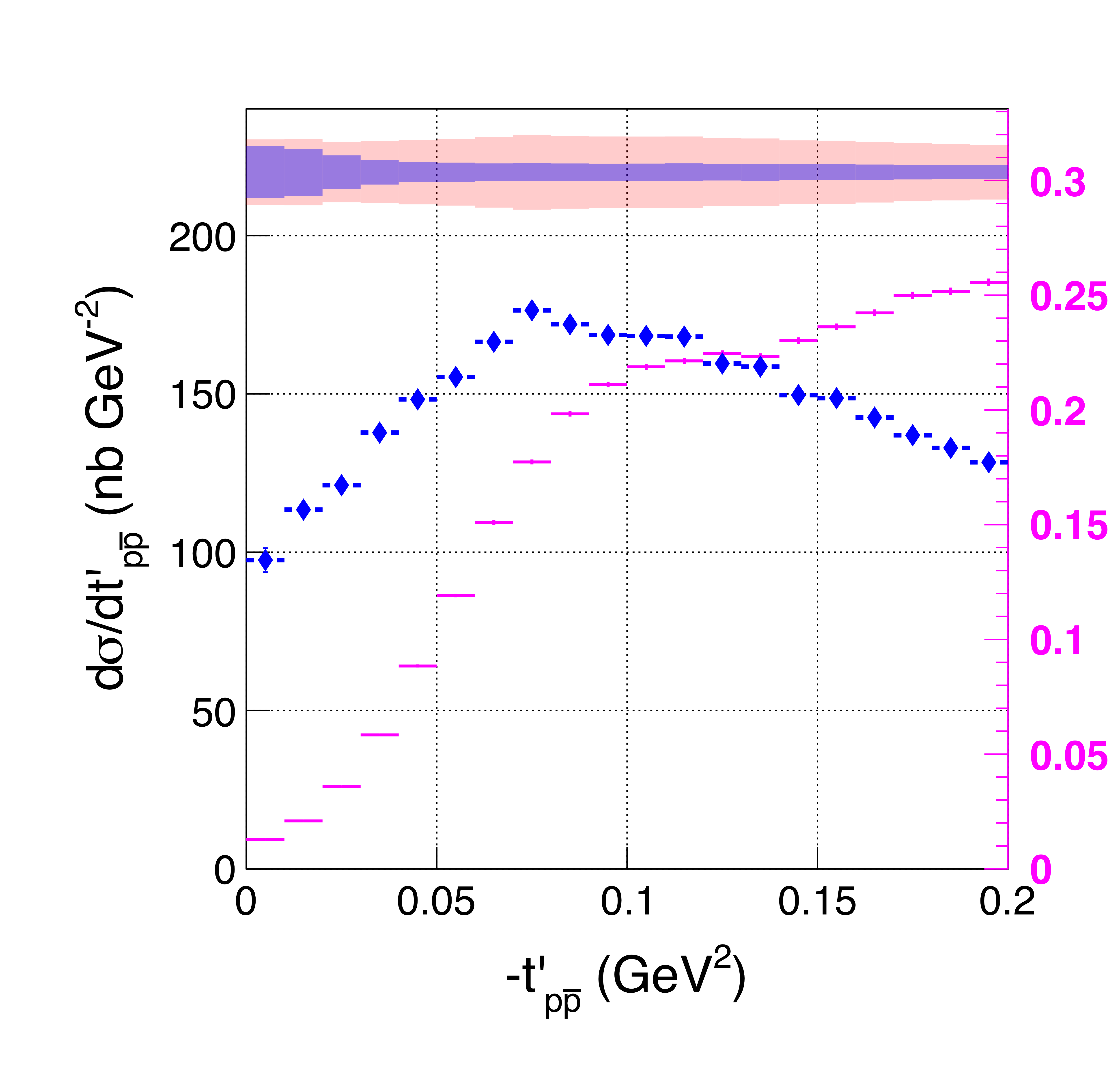 The differential cross section for the $p\bar{p}$ channel with respect to the reduced four-momentum transfer to the pair, emphasizing the low $t^\prime$ region for data in the slice of beam photon energy $8.5-9.0$ GeV with $0.01$ GeV$^2$ binning. The magenta points show the acceptance as a function of $-t^\prime$, with the right-hand magenta axis. The light blue band depicts the model-dependent systematic uncertainty and the pink band is the total uncertainty of the cross section. |