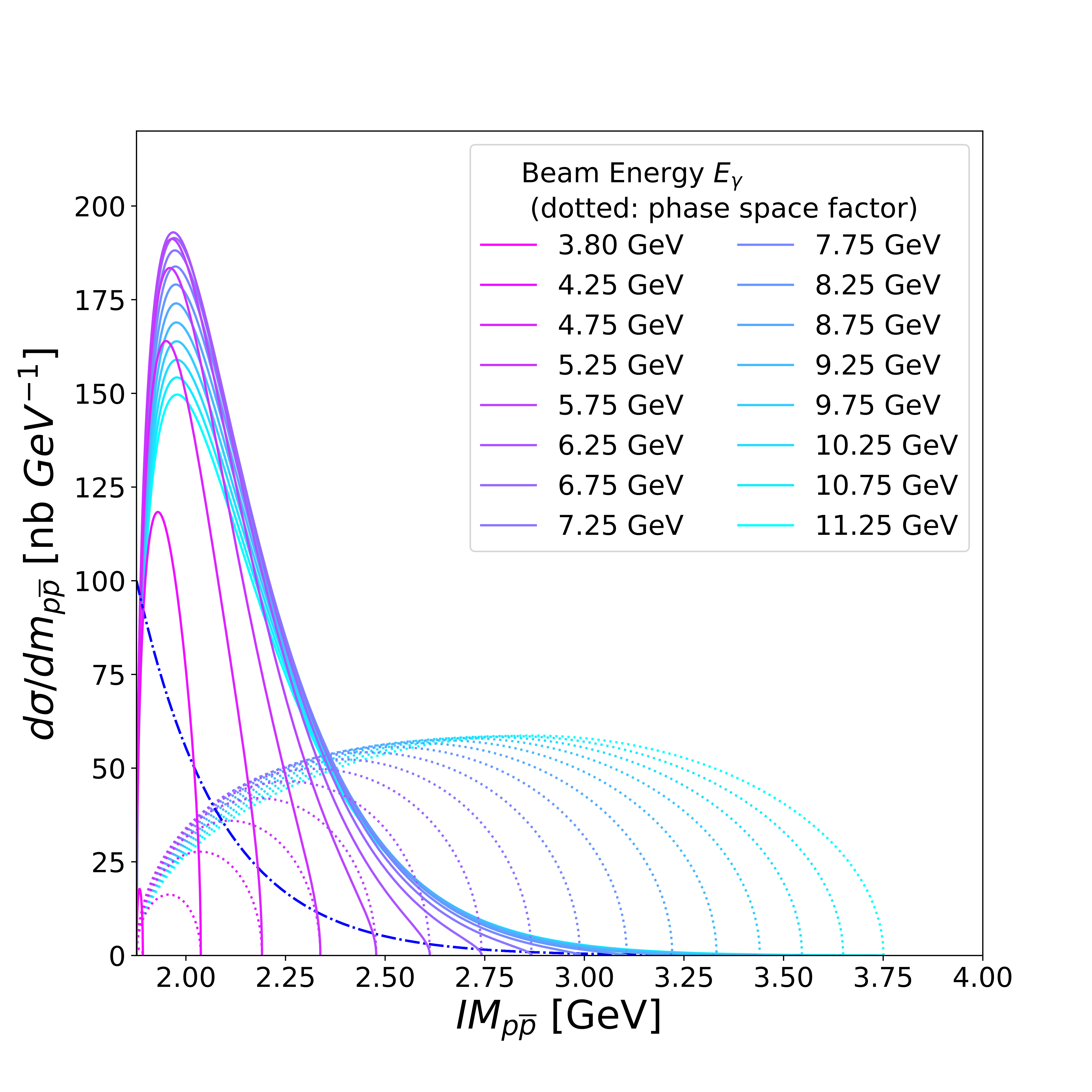 Components of the beam-energy dependent clustering model of the $p\bar{p}$ mass distribution. A single exponential mass profile of the $p\bar{p}$ system before folding in three-body phase space is shown by the blue dash-dot curve. The phase space factors (Eq. 6) across beam energies are the light blue dotted lines. The resultant invariant mass distributions (Eq. 14) at different beam energies are shown as solid lines of various shades. Compare to Fig. 30. |