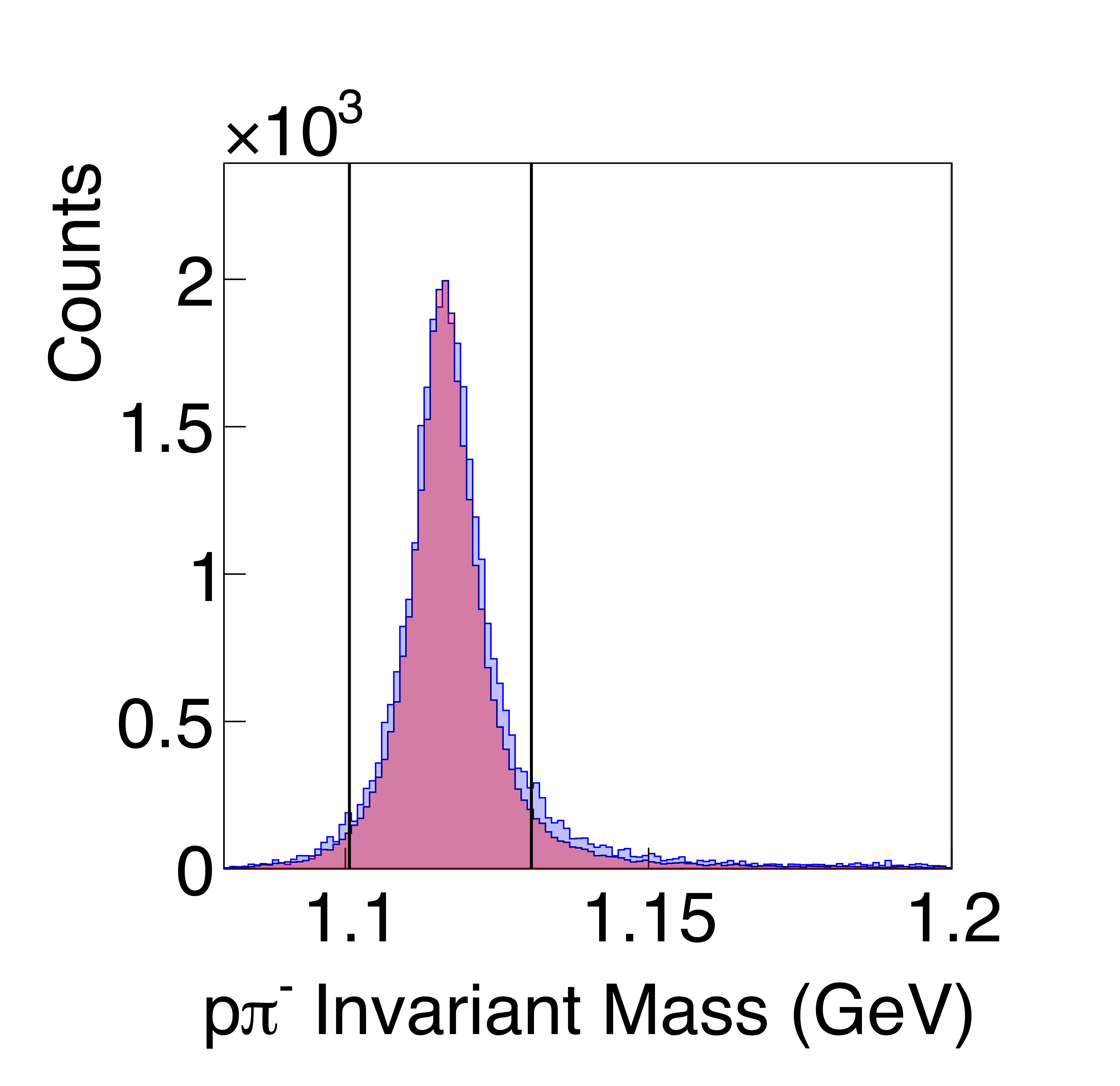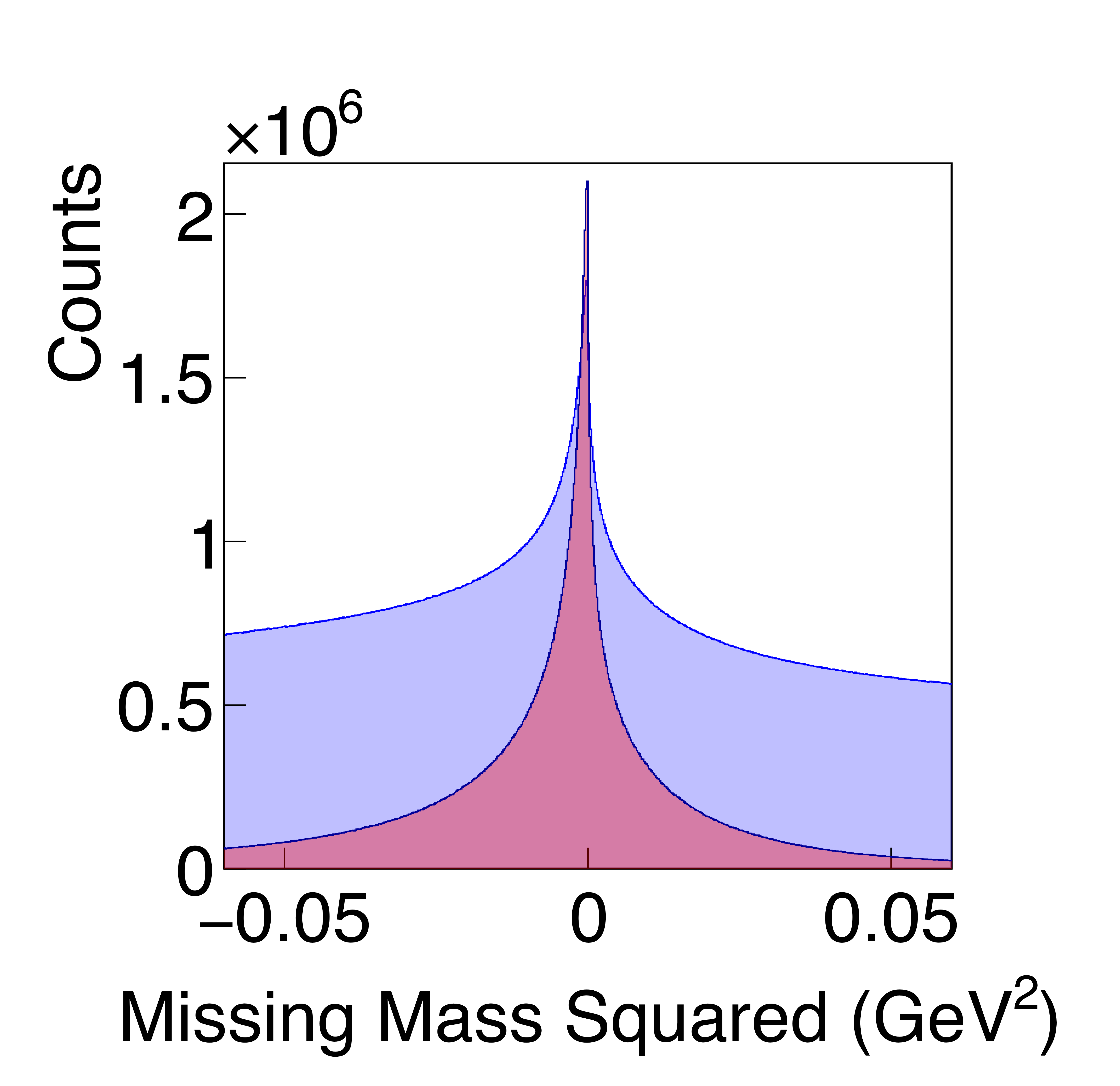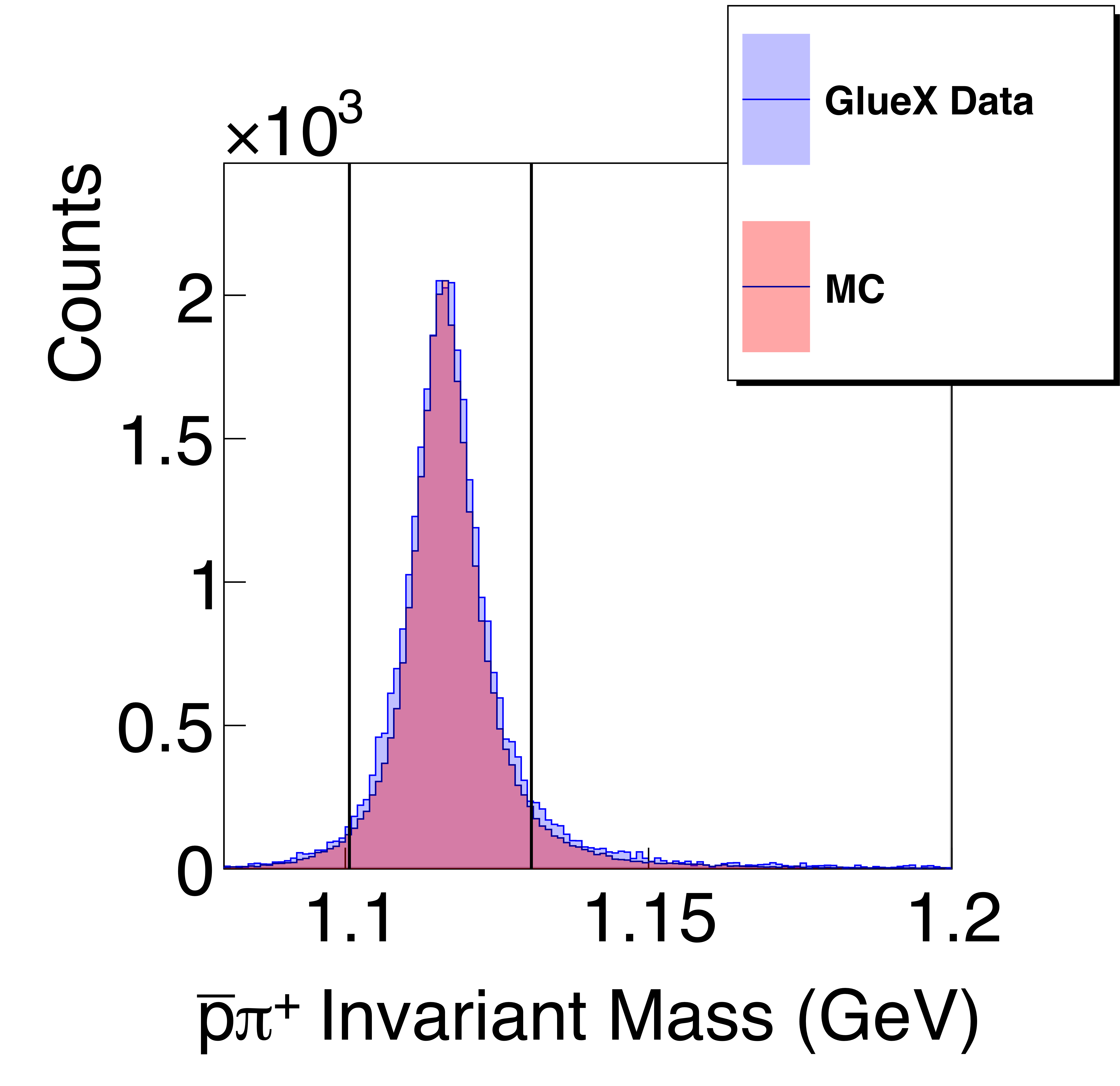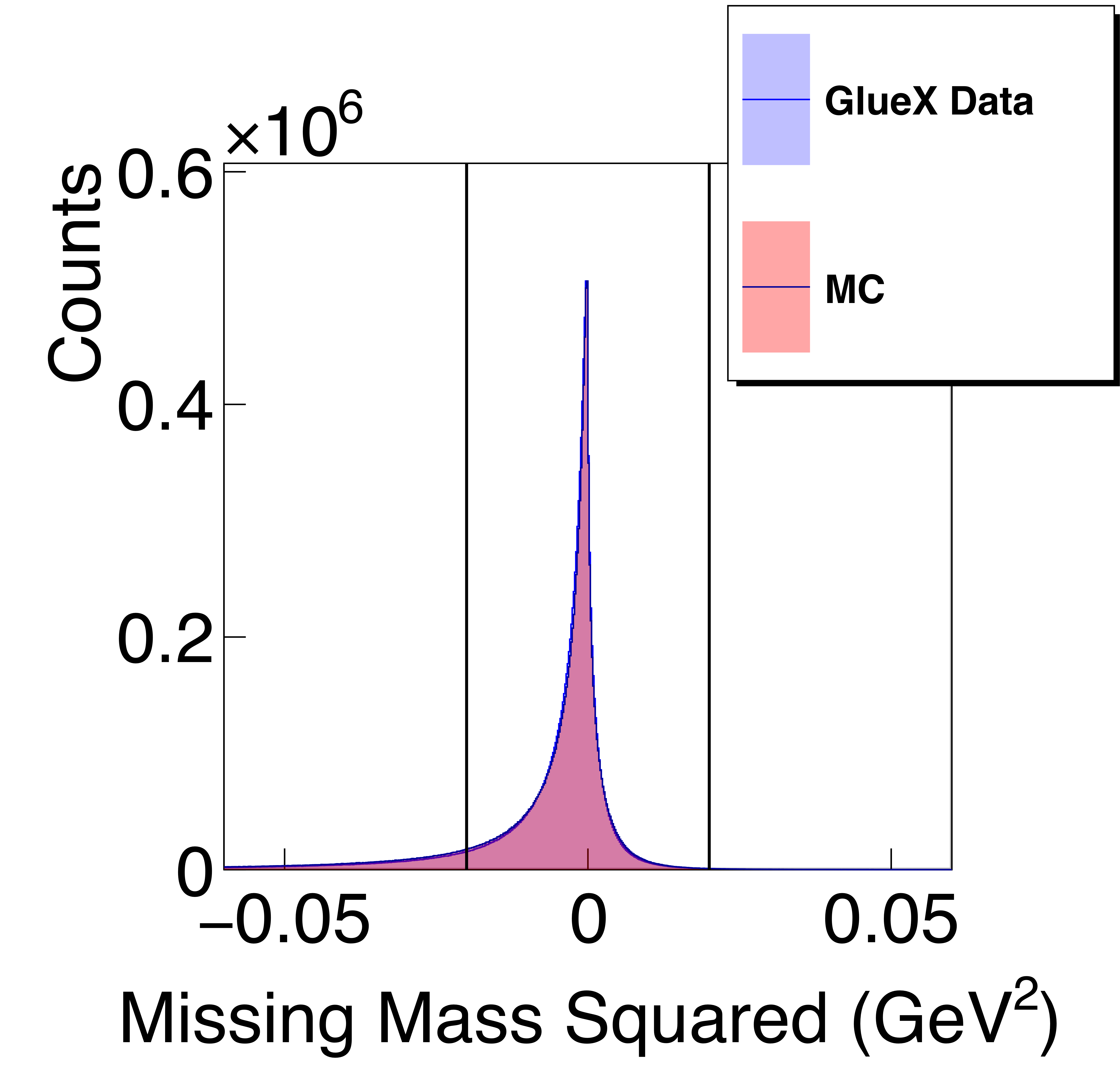 Missing-mass squared for kinematic fits to the $\gamma p \rightarrow p\bar{p} p$ reaction. The initial skimmed data (blue) are compared with signal Monte Carlo (red) with (a) minimal cuts applied, and (b) final cuts applied, except for the selection on the missing-mass squared itself (marked by black solid lines). |