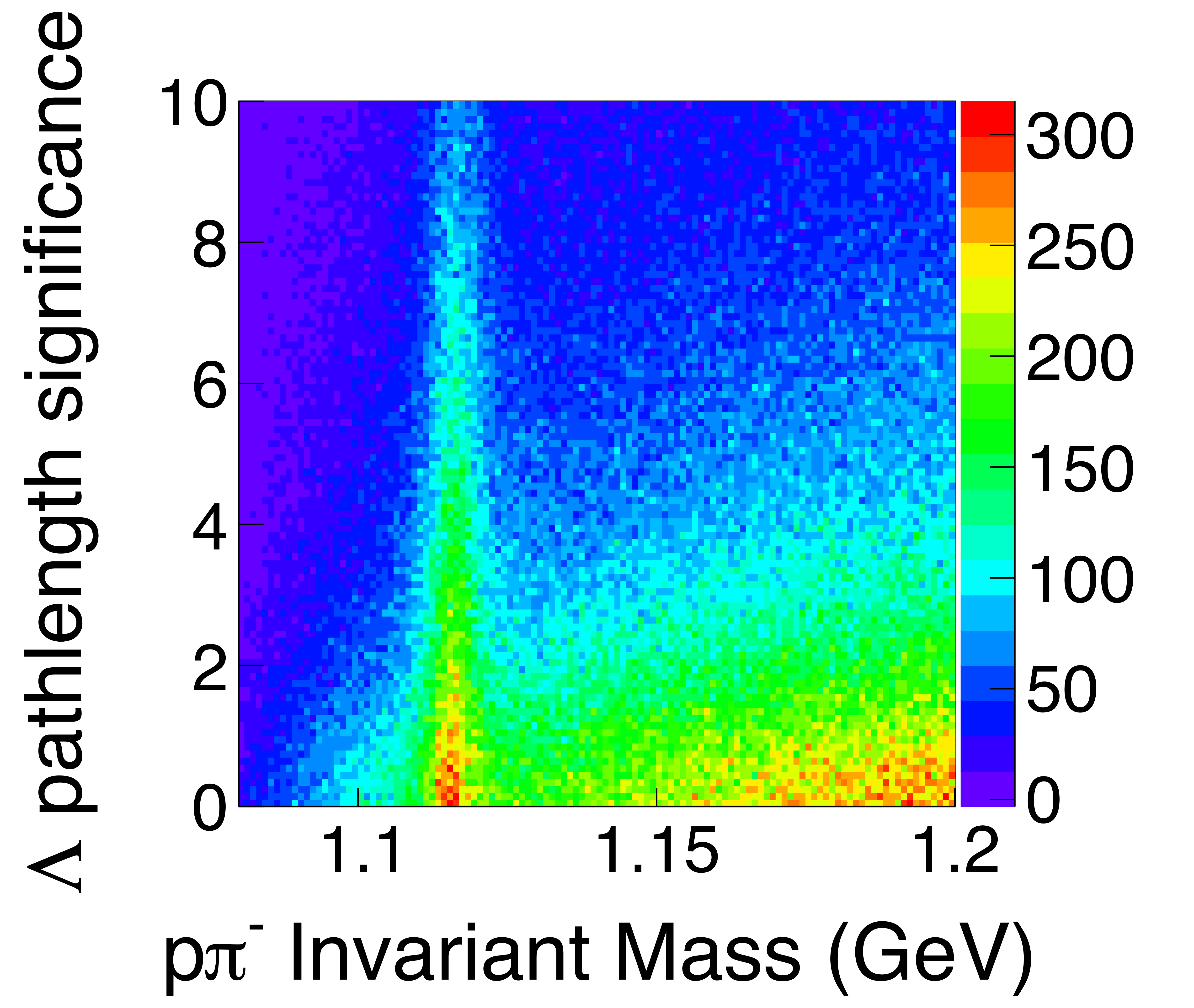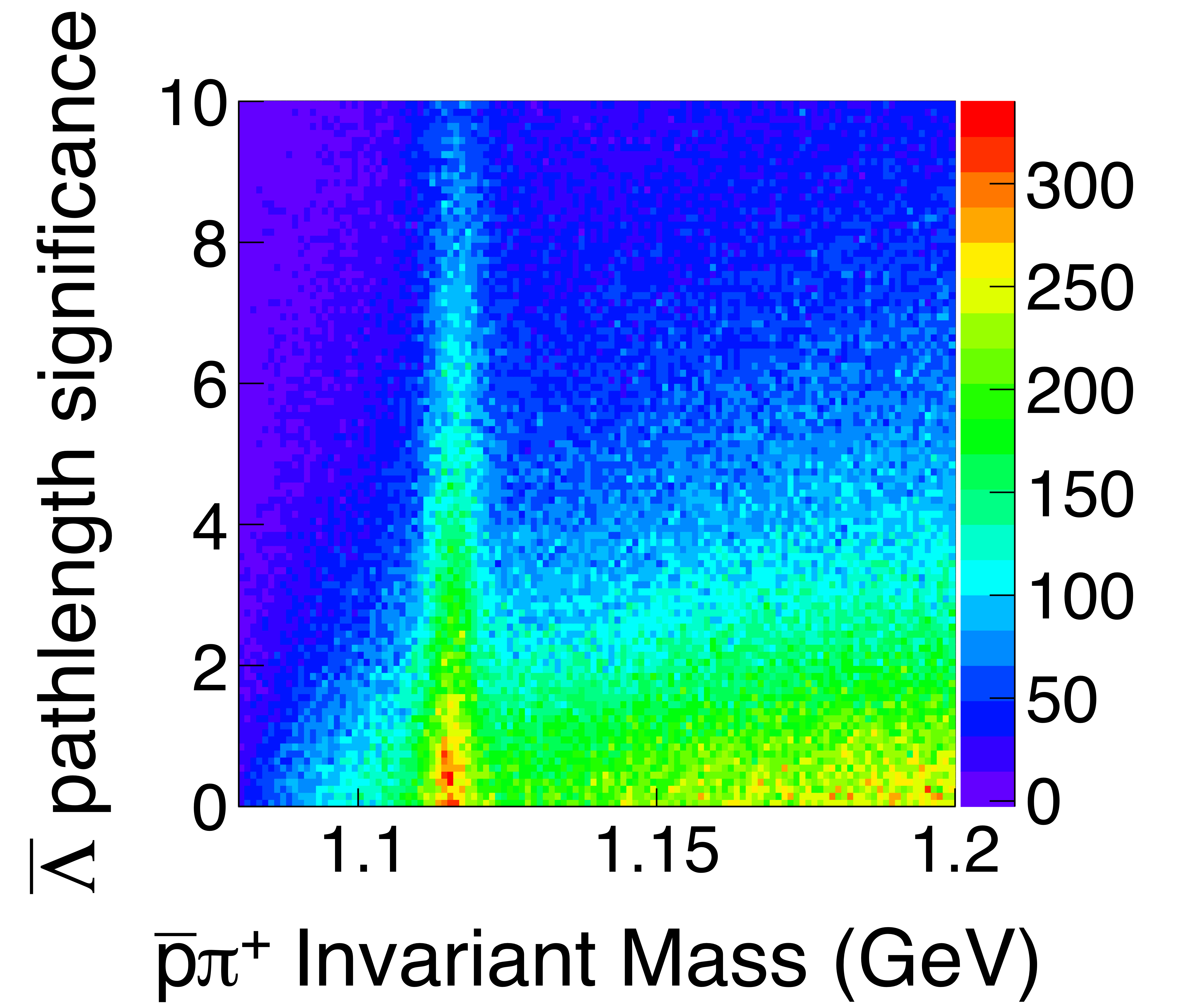 The correlation between the hyperon decay path-length significance ($PLS$) and the invariant mass distributions for (a) $\Lambda$ and (b) $\bar{\Lambda}$ particles. The masses were unconstrained in the $\gamma p \rightarrow \Lambda\bar{\Lambda} p$ kinematic fits. |