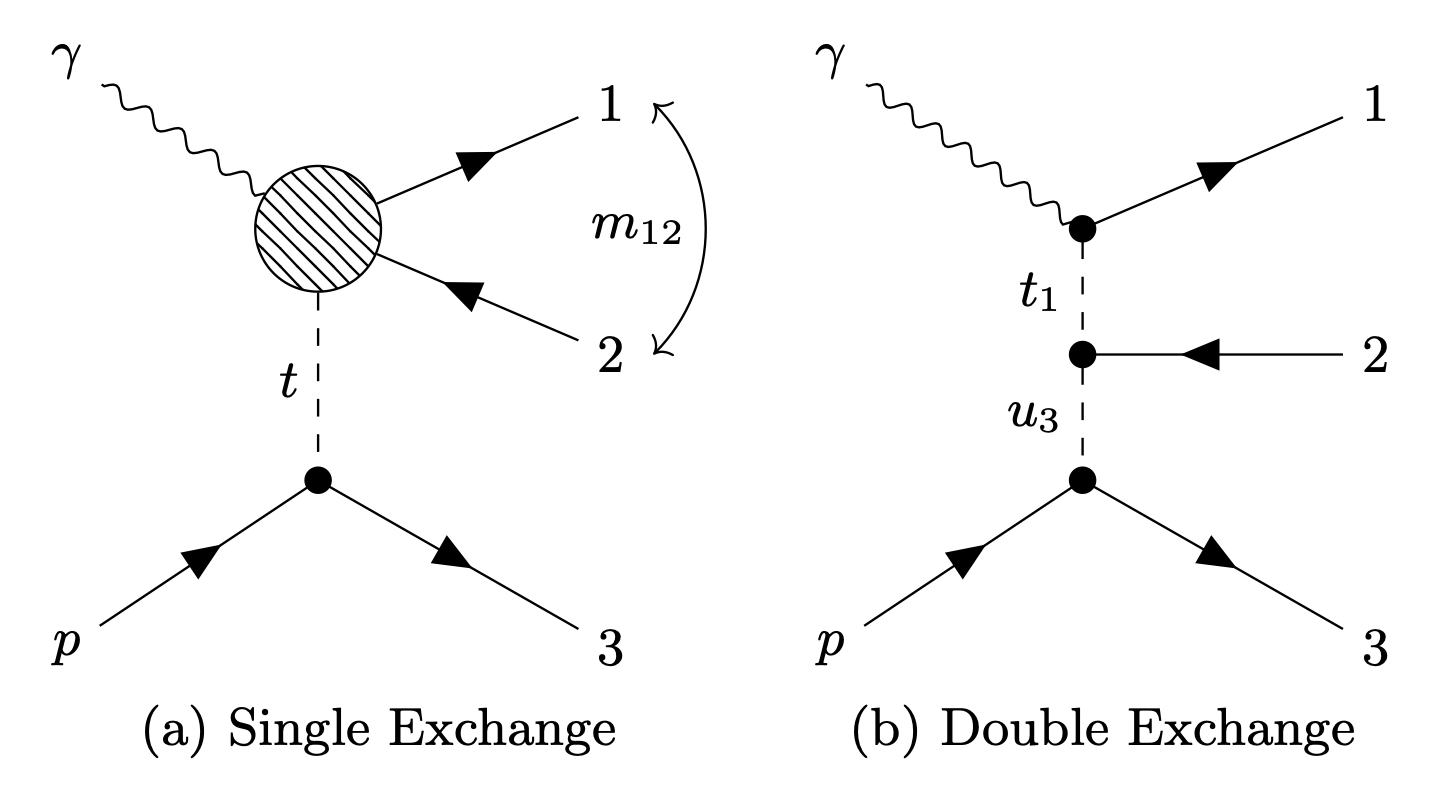 Diagrams of the (a) single t-channel exchange and (b) double t-channel exchange model formulated for the reaction $\gamma + p \rightarrow 1 + 2 + 3$. Particle 2 is the anti-baryon in each case. |