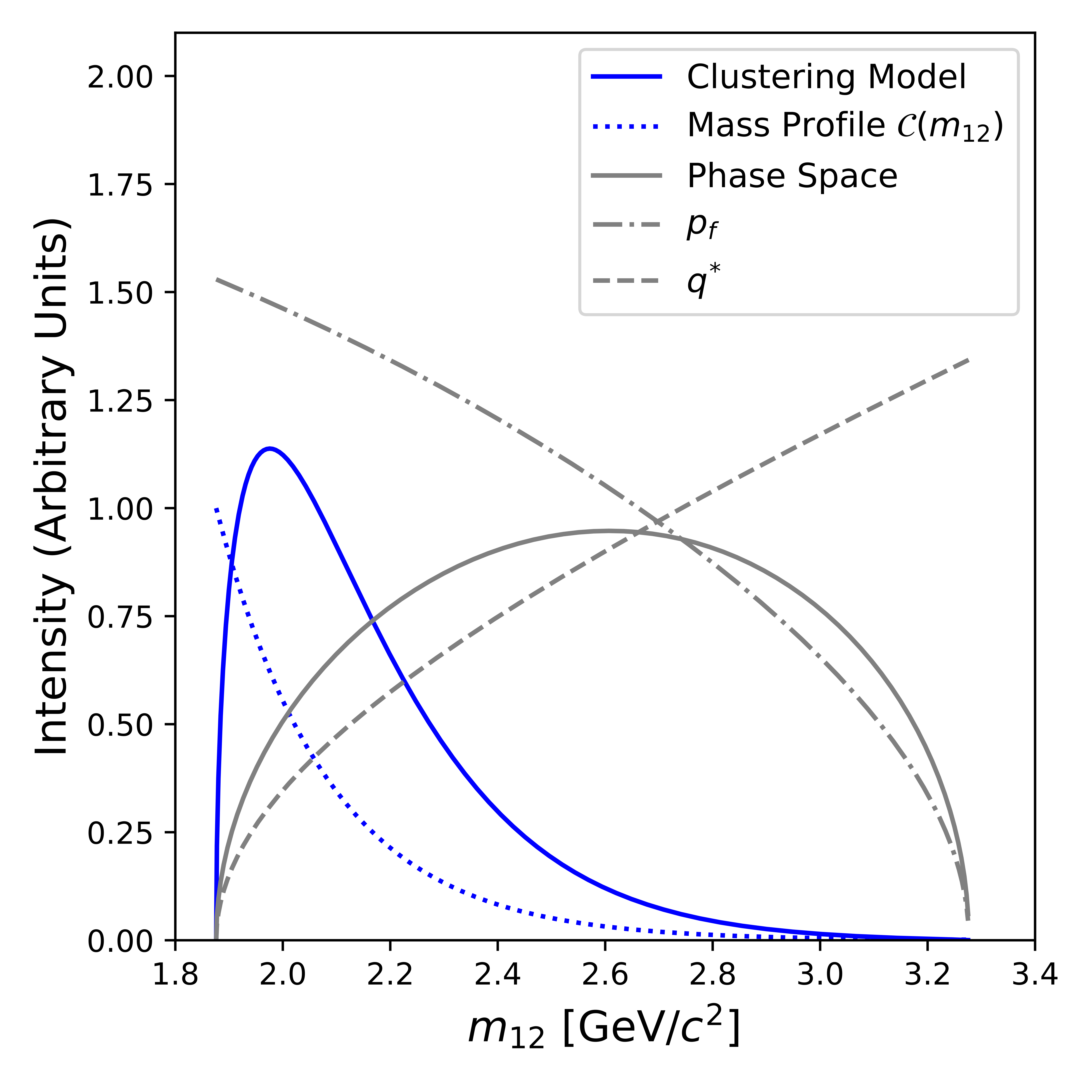 Intensities (in arbitrary units) of components of the 3-body kinematics for the reaction $\gamma p \rightarrow \{p\bar{p}\} p$ as a function of $m_{12}$ at $E_{\gamma} = 9.0$ GeV, the two-body decay momentum $q^*$ (gray dashed line) in the $p\bar{p}$ pair rest frame; the two-body breakup momentum $p_{f}$ (grey dot-dashed line) between the recoil proton and $p\bar{p}$ system in the overall CM frame; and the full three-body phase space $Phsp(m_{12})$ (gray solid line) (Eq. 6). The phase space is modified by an exponential mass profile introduced as $\mathcal{C}(m_{12})$ (blue dotted curve)(Eq. 10), leading to the differential cross section line shape of the ``clustering" model (blue solid curve) given in Eq. 14 |