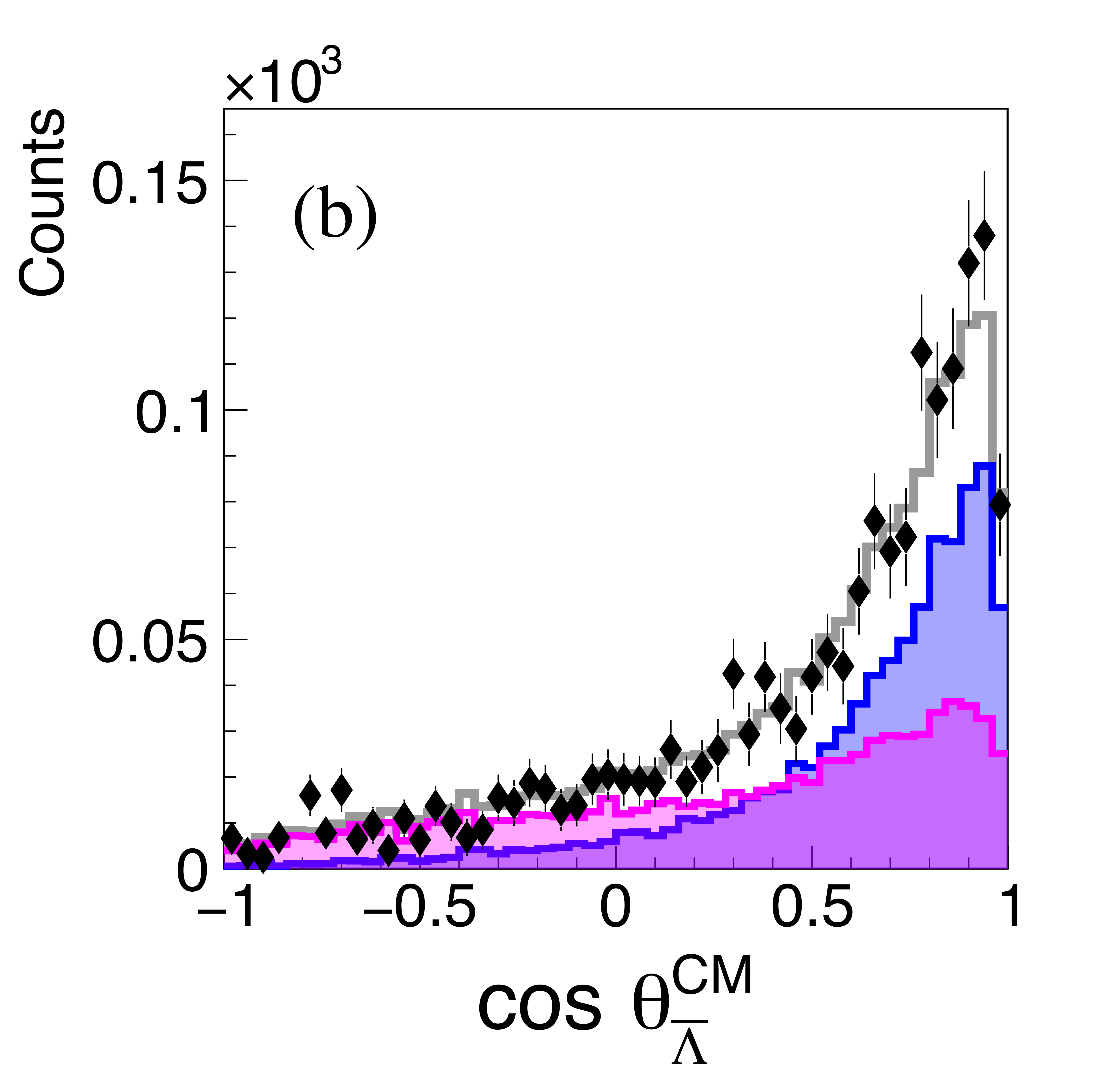 The angular distributions of the three particles in the $\gamma p \rightarrow \{ \Lambda \bar{\Lambda} \} p $ reaction channel in the overall CM system. The points and curves are organized as in Fig. 7. Unlike the proton reaction shown in Fig. 7, only one Double Exchange component is needed in the hyperon cases (magenta filled). |